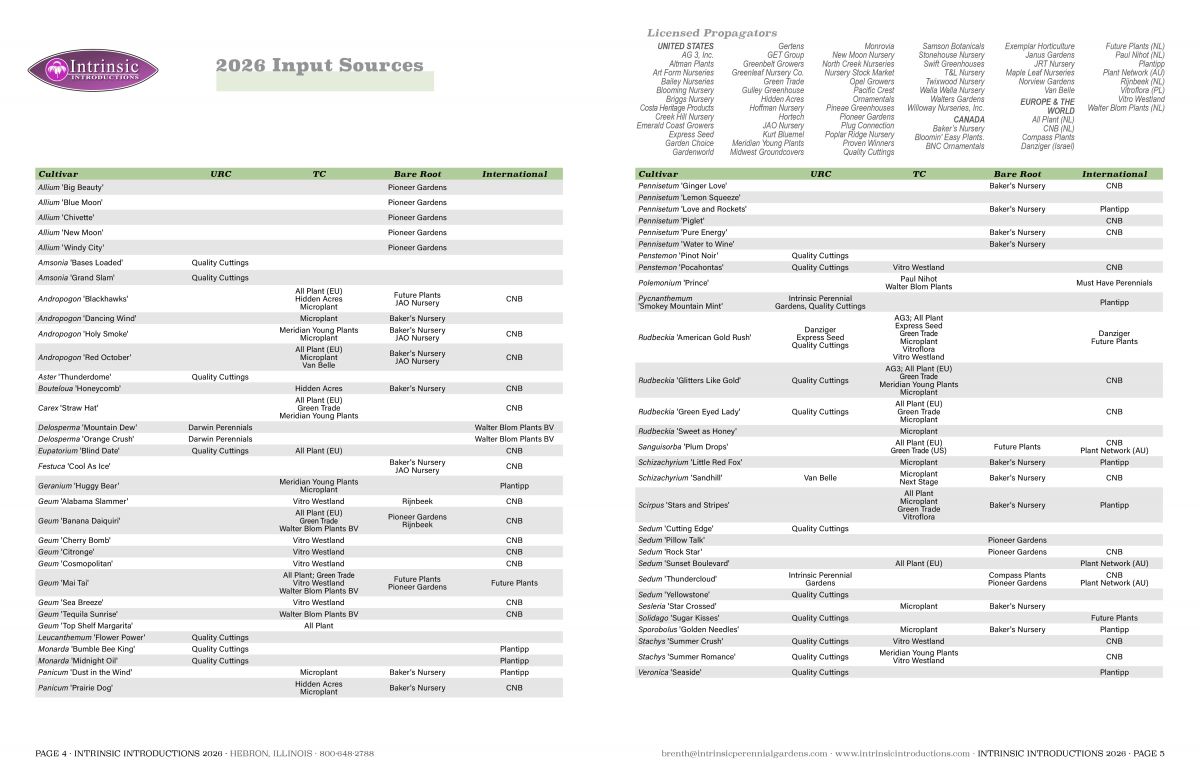Grass and grass-like cultivars appear in a green field to differentiate them from the other perennials. Native genera are also marked. A comparison chart lists input sources for unrooted cuttings (UR), tissue culture (TC), and bare root. Additionally there is a list of licensed propagators, from the United States, Canada, Europe, and the world.