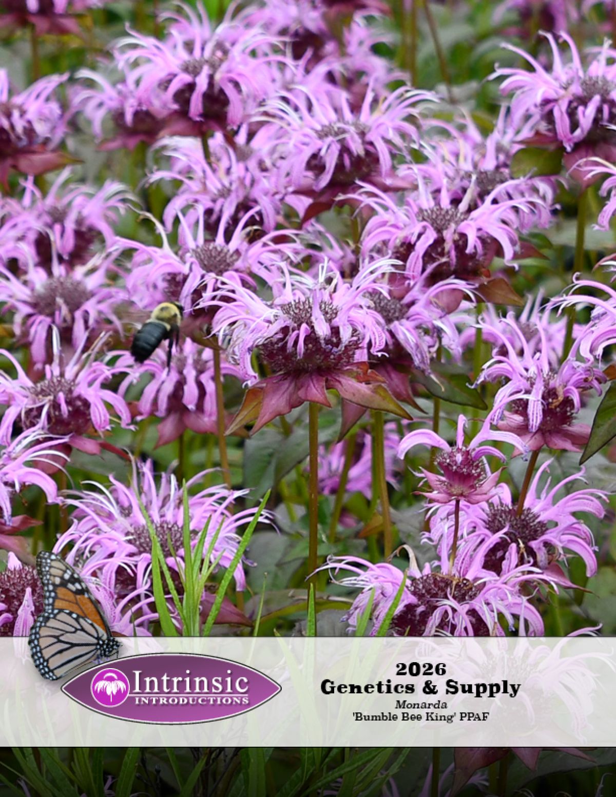 01-15-26 — Intrinsic Introductions releases the 2026 Genetics & Supply catalog featuring Monarda 'Bumble Bee King' as the cover article. This year’s catalog includes the full line of breeding from Brent Horvath, new plant introductions for 2026, formal names for each plant, and input sources for the trade along with photos and descriptions of each cultivar.