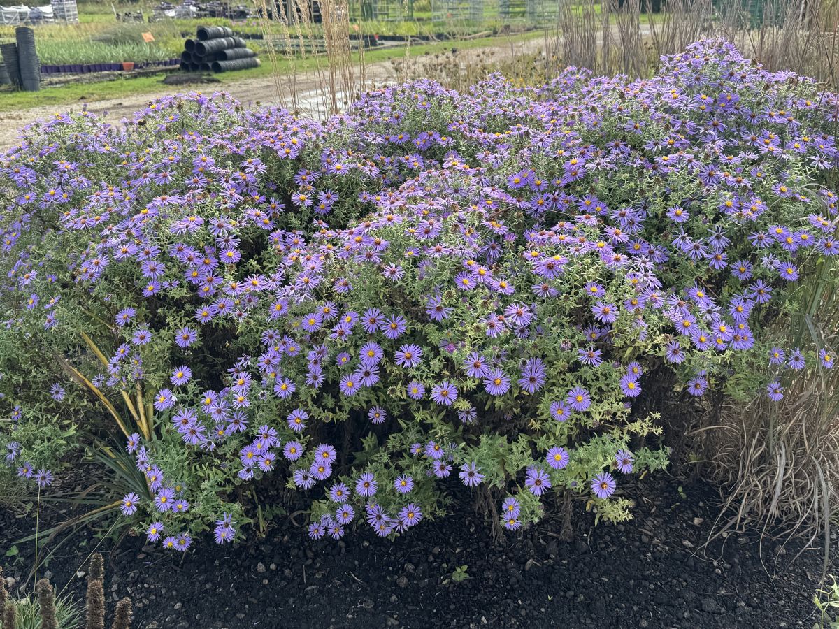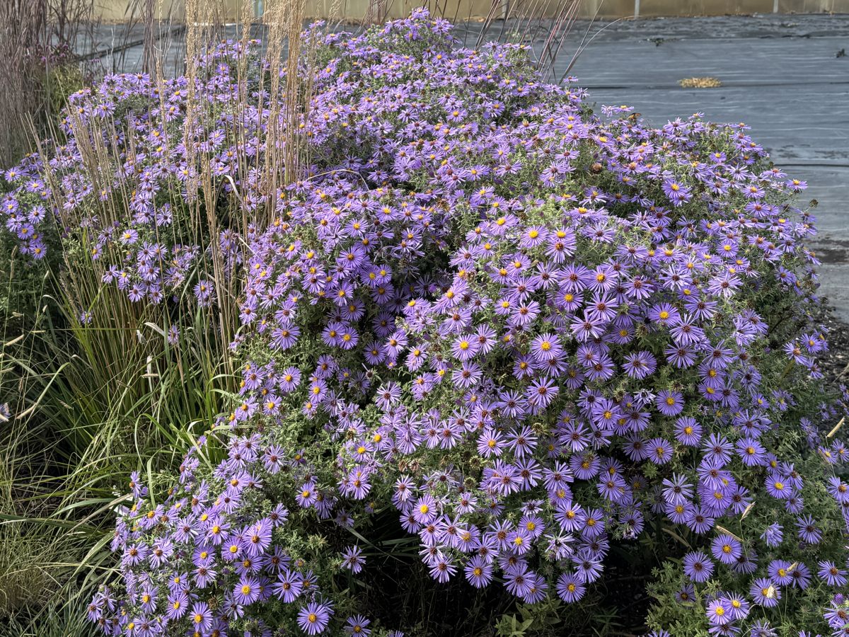 Substantial plants bloom from late summer to early fall with lavender-blue flowers and a mounding habit, growing 30 to 36 inches tall and wide. Fragrant foliage keeps deer and rabbits from browsing. Full sun, average to well-drained or dry soil. My kind of town aster.