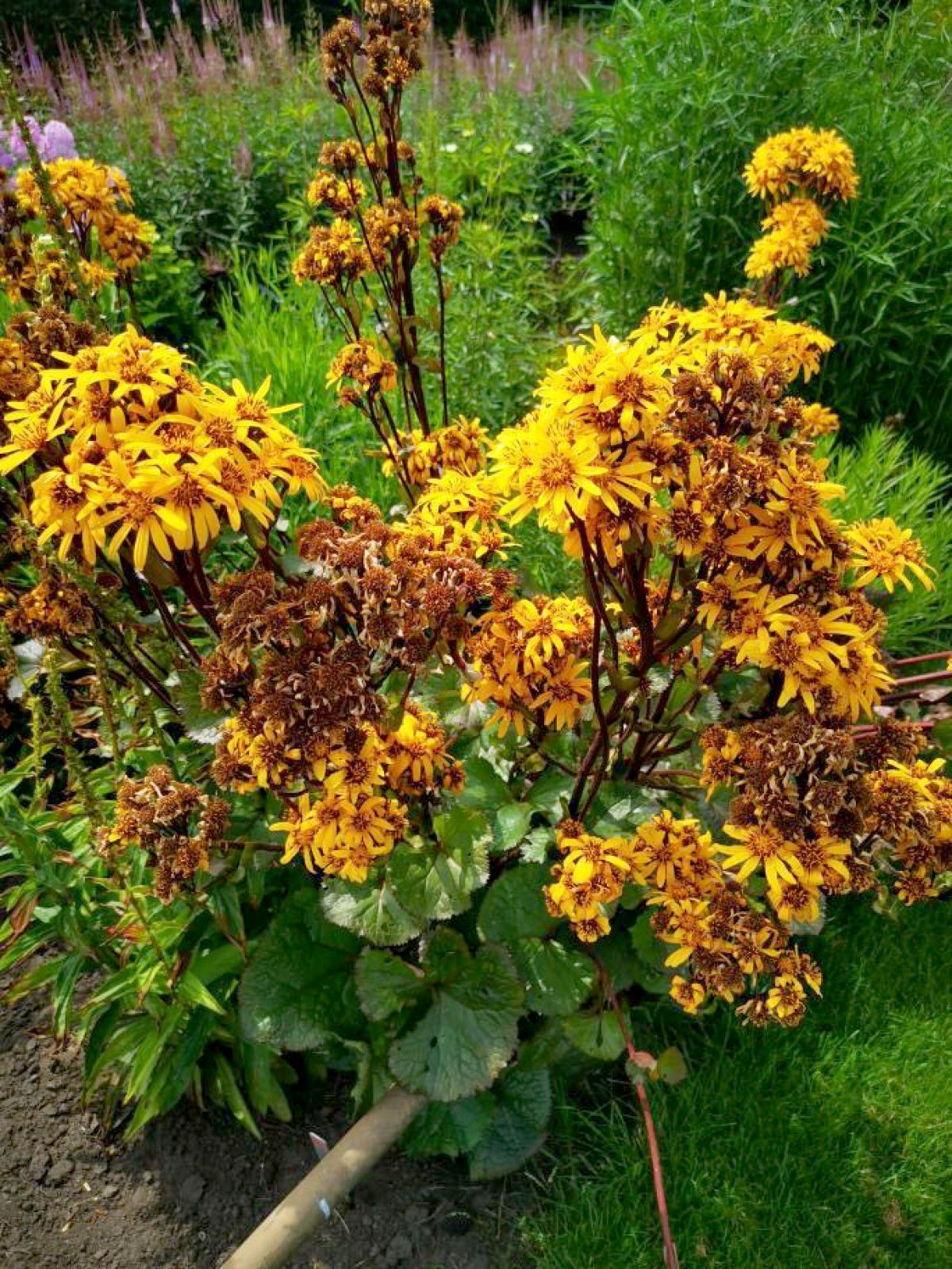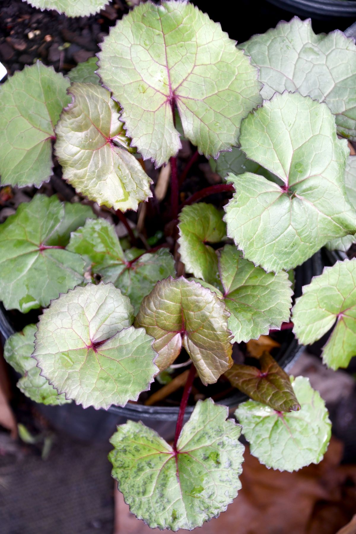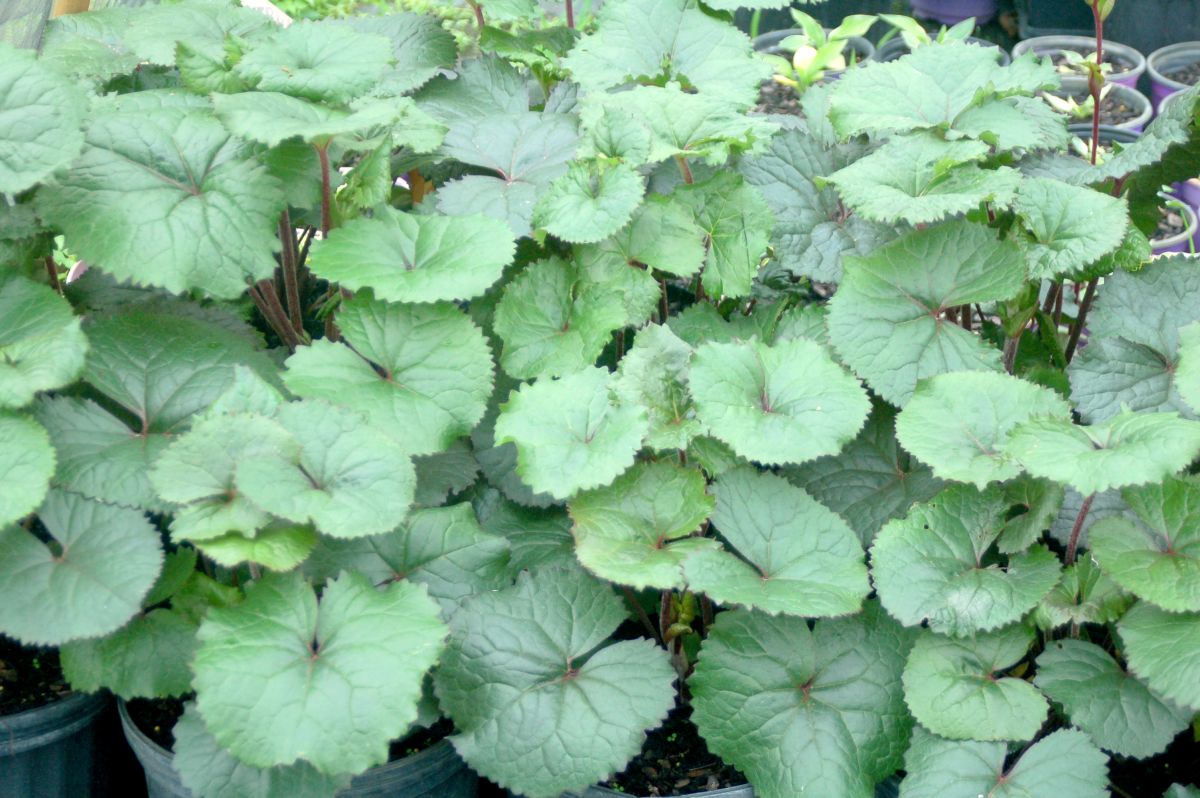 After many years of observation this hybrid stands out to us. Matte green foliage with new leaves emerging lighter green and deepening with age gives the substantial plants more depth. Hybrid vigor, and rhubarb red stems hold clustered gold flowers on four-inch stems in July. Part shade with rich moist soil.