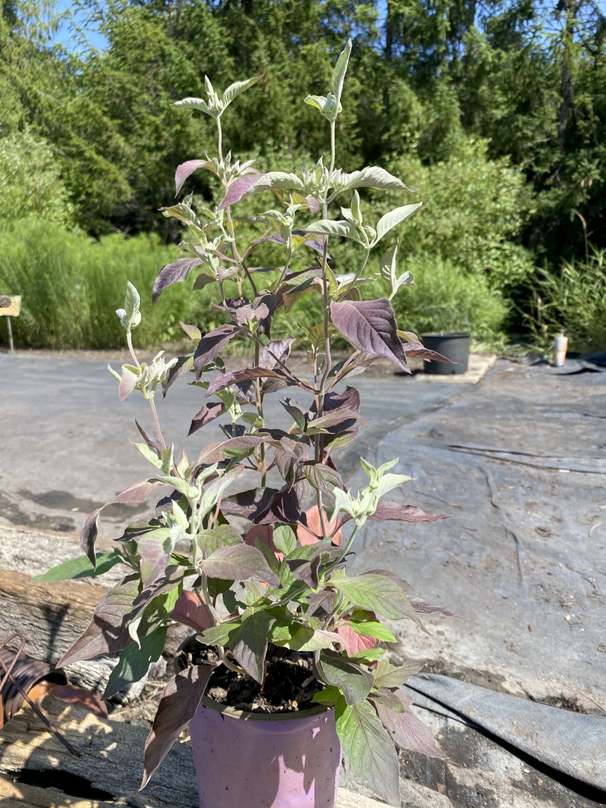One of our most exciting new plants has a wide appeal to humans and pollinators as well. This hybrid incanum has a purple cast to the foliage below the silvered tips, and bract-like leaves surrounding the flower clusters at the tips of the long stems. These rhizomatous plants have hybrid vigor. Most any soil but wet.