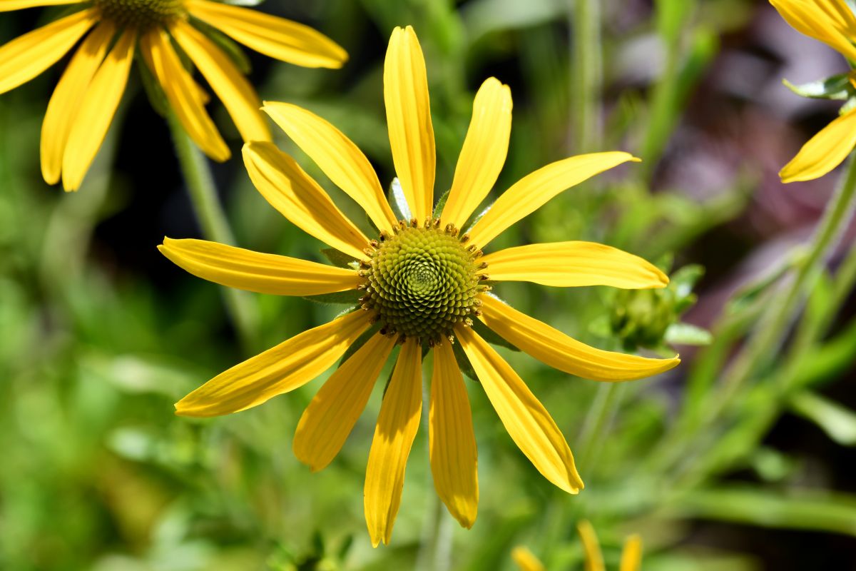 A new look in rudbeckia, this one begins with green-eyed flowers softening to chartreuse-yellow and eventually turning brown. Upright stems reach 30 inches tall on a plant 18–24 inches wide, all above thin-leaved rosettes of foliage. Full sun; average to dry soil.