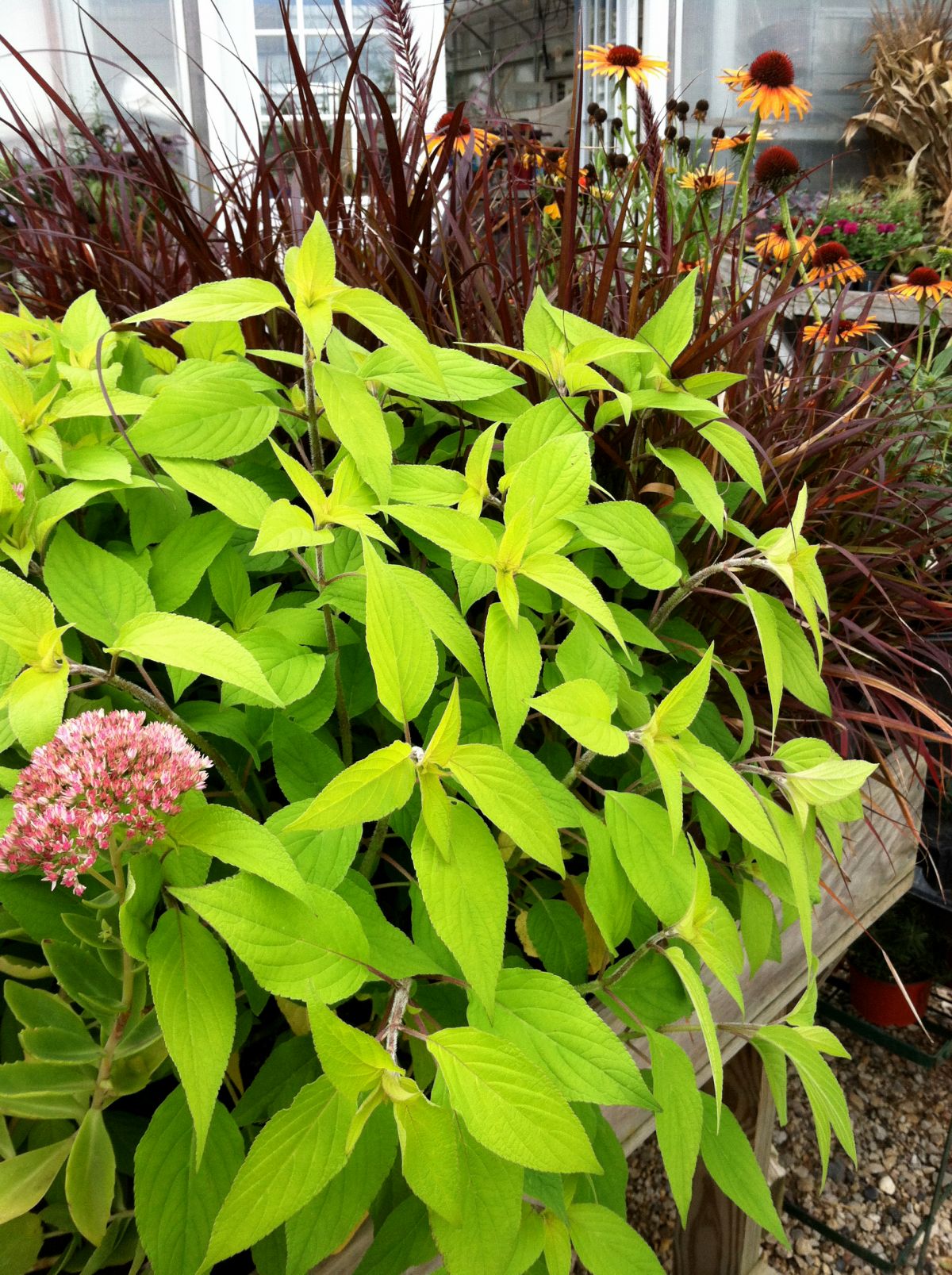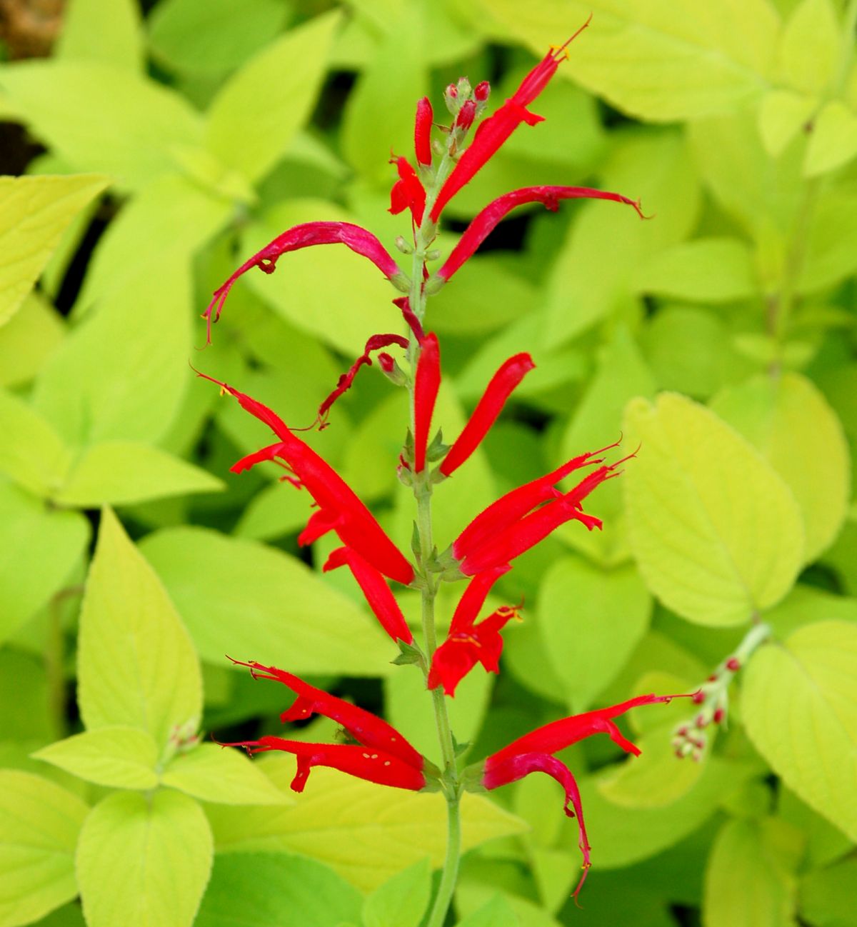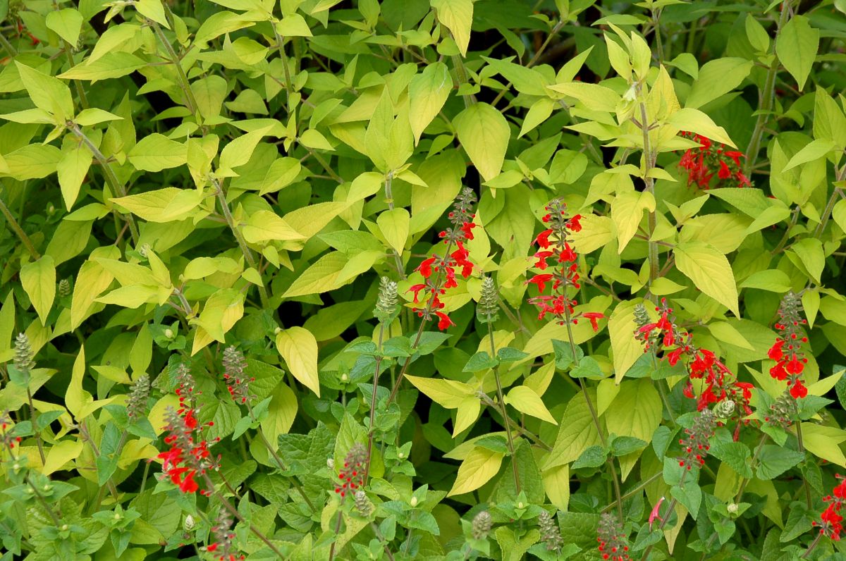 This tender perennial has limey yellow foliage that smells like pineapple and looks good all year. If kept from frost, shrubby plants bloom scarlet red at the end of October, in striking contrast to the leaves. Pineapple sage prefers well-drained to moist or even wet soil.