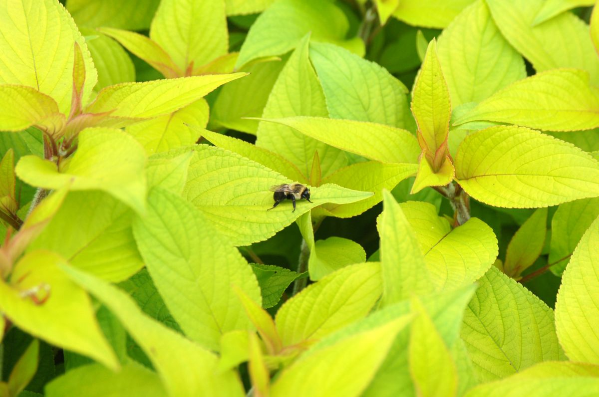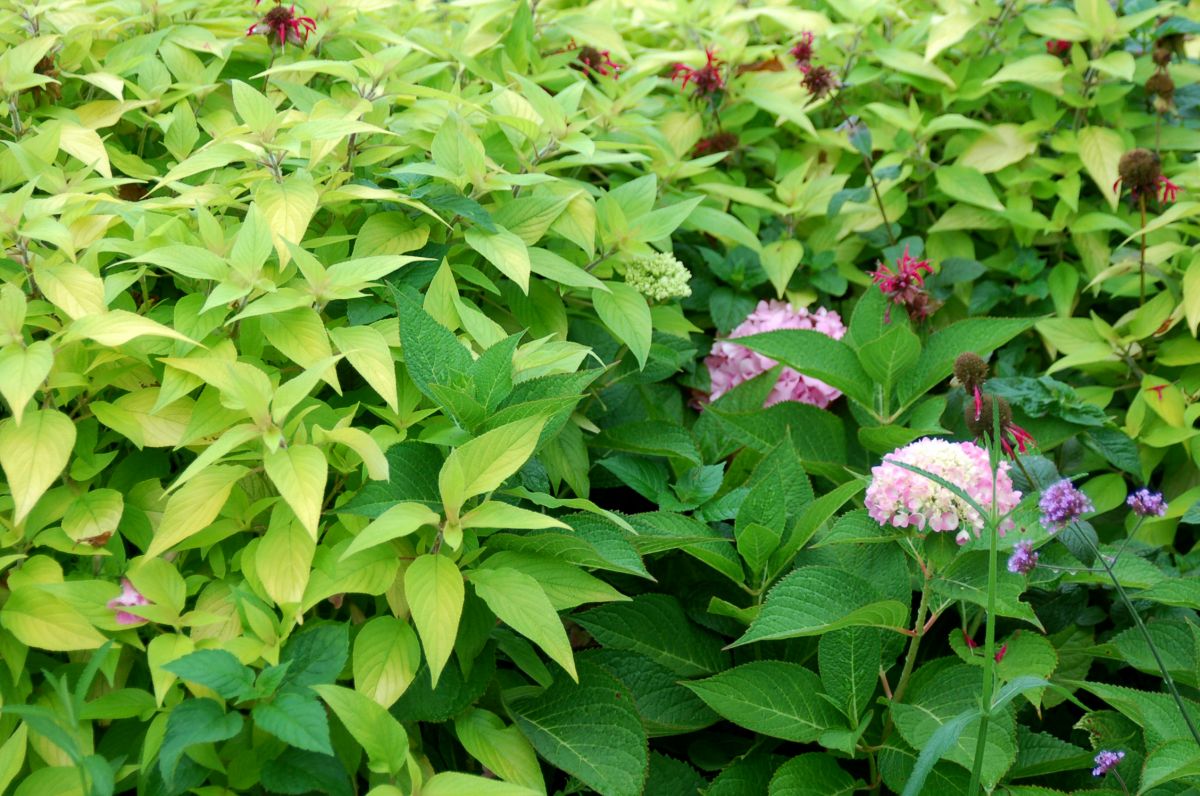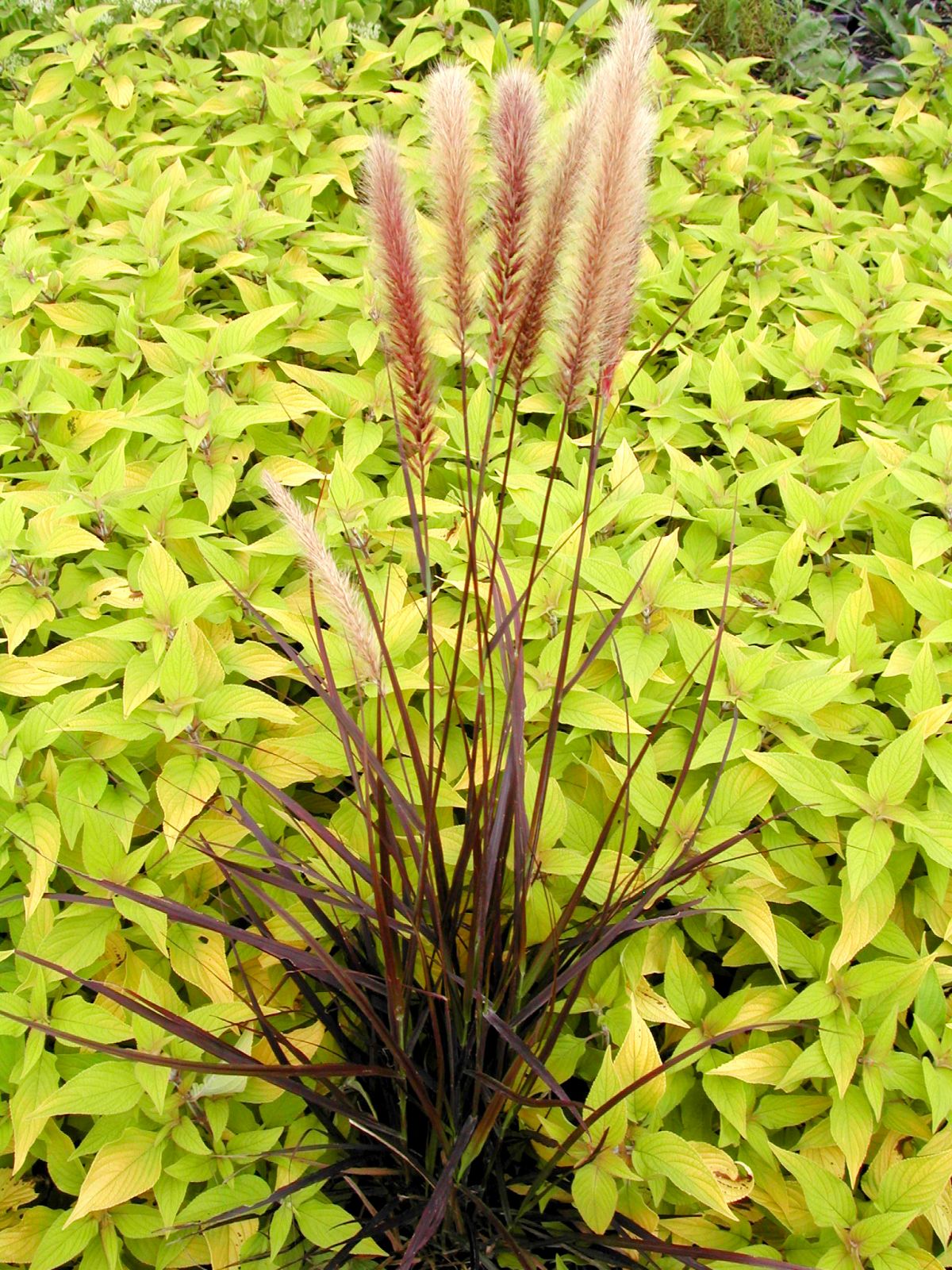 This tender perennial has limey yellow foliage that smells like pineapple and looks good all year. If kept from frost, shrubby plants bloom scarlet red at the end of October, in striking contrast to the leaves. Pineapple sage prefers well-drained to moist or even wet soil.