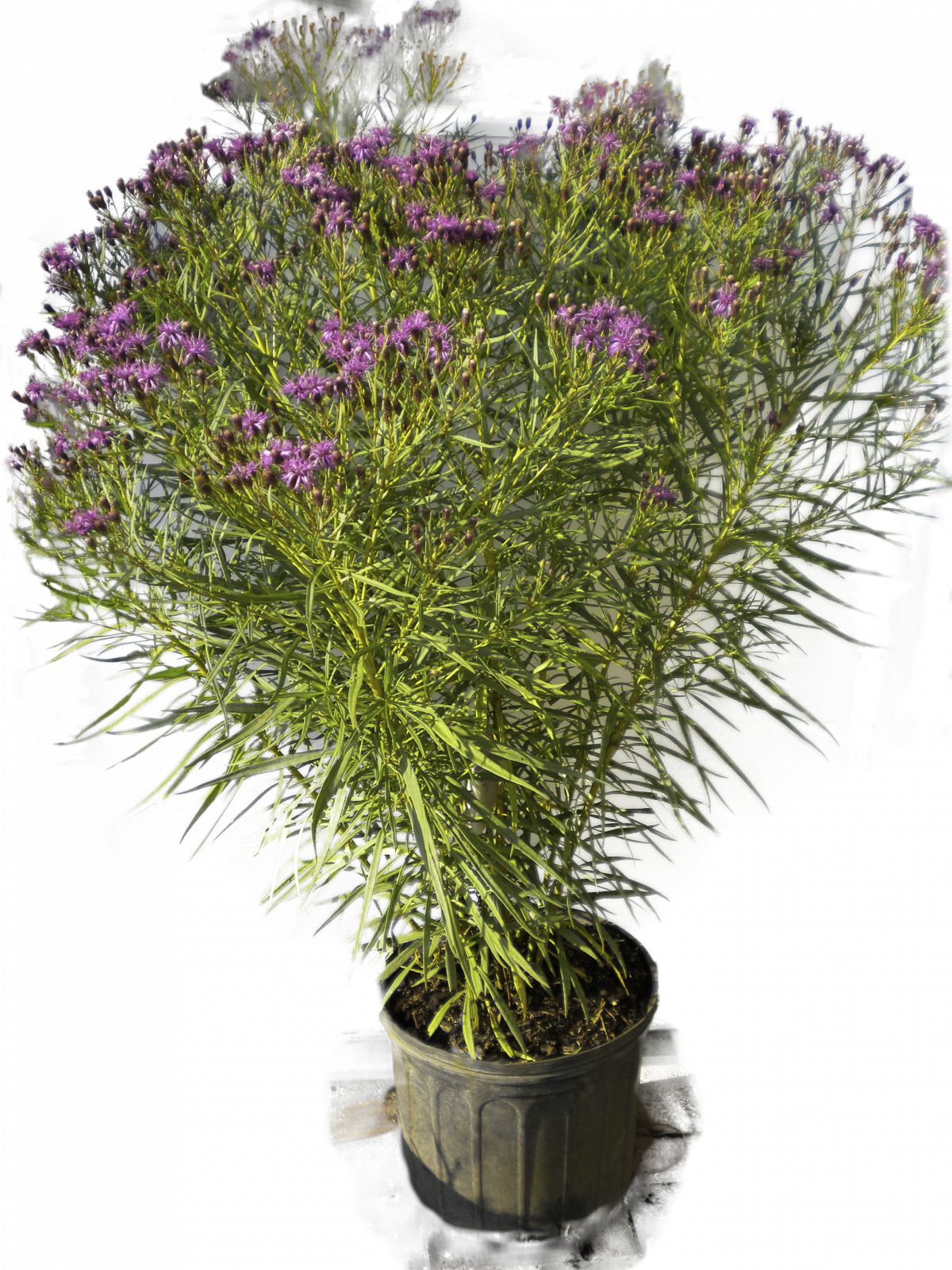 A favorite selection, this hybrid came from seed sown as Vernonia lettermanii. The other parent is unknown but it had broad foliage. 'Southern Cross' has intermediate foliage that measures up to a half-inch wide; it’s deep green and looks good all season long. Purple flowers emerge from deep purple buds that look like little jewels. Blooms can have thin white filaments along with lacy purple petals.