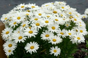 creamy white flowers above dark foliage