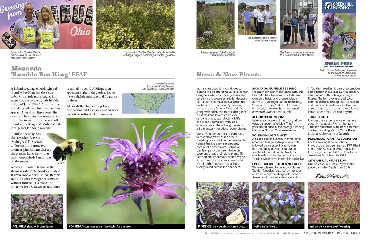 01-15-26 — Intrinsic Introductions releases the 2026 Genetics & Supply catalog featuring Monarda 'Bumble Bee King' as the cover article. This year’s catalog includes the full line of breeding from Brent Horvath, new plant introductions for 2026, formal names for each plant, and input sources for the trade along with photos and descriptions of each cultivar.