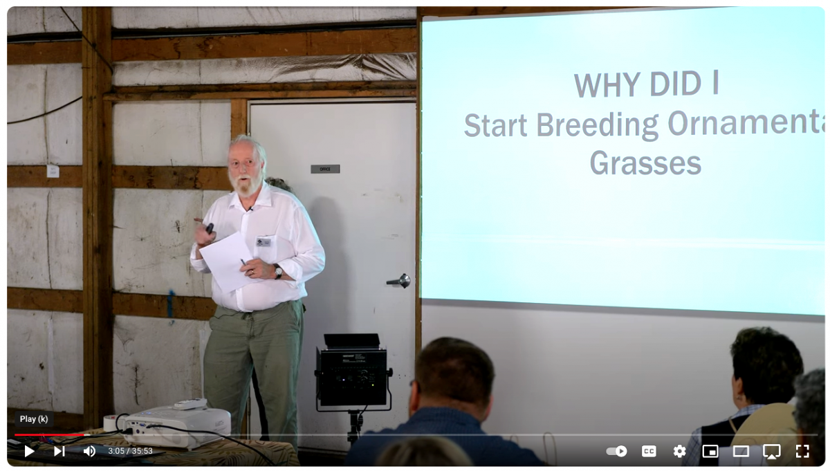 Based in zone 6, Martin has a special interest in hardy grasses with early flowering plumes. He covered a number of topics including how he started breeding ornamental grasses; observing plants over time to notice differences; breeding fescue, panicum, and miscanthus; and use of grasses across the southern tier of Canada, from British Columbia to Quebec. He also has discussed Brent’s Pennisetum ‘Water to Wine’ and Pennisetum ‘Yellow Ribbons’.