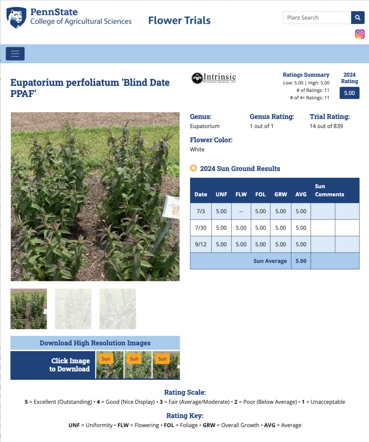It was a great year for Intrinsic Perennial Gardens at the 2024 Penn State Flower Trials. Intrinsic’s entries had amazing performances. Eupatorium ‘Blind Date’ earned a perfect 5.0 score in its third and final year of the in-ground trials and was awarded the top Best of Show honors. ‘Blind Date’ is a native wetland species with chocolate-red foliage topped by milky white flowers in summer. The blooms are held on three-foot tall stems, and the leaves become beautifully bronze in full sun. It combines easily with other varieties in the garden.