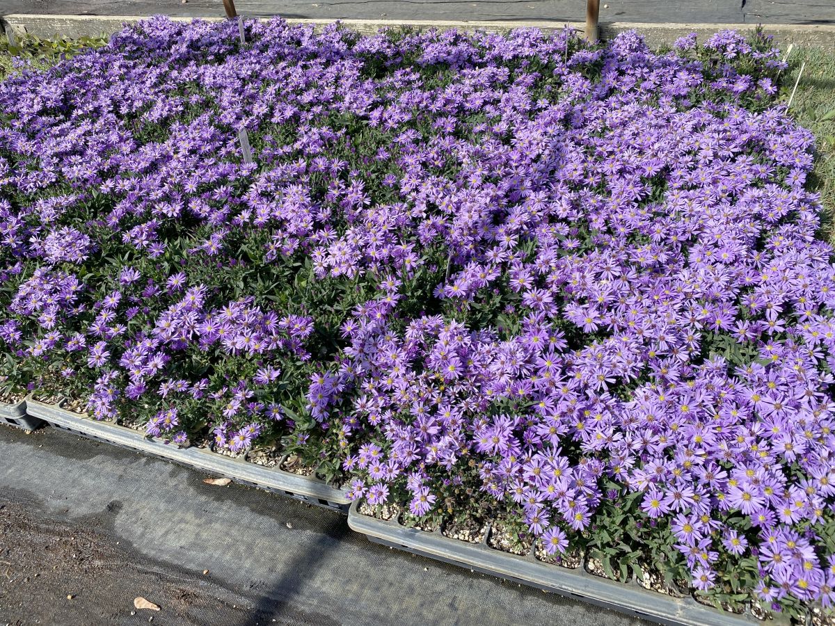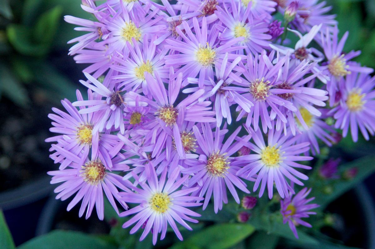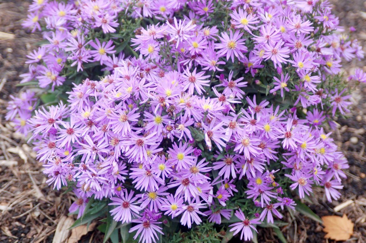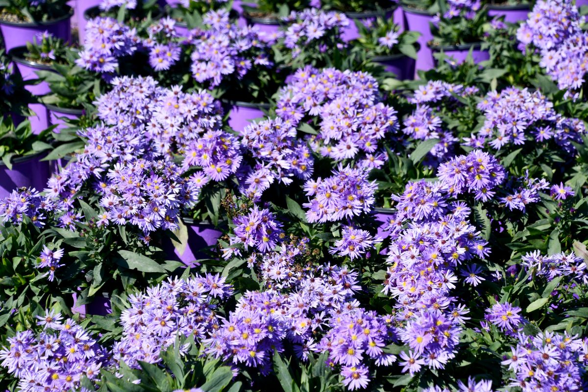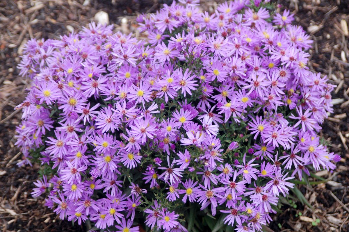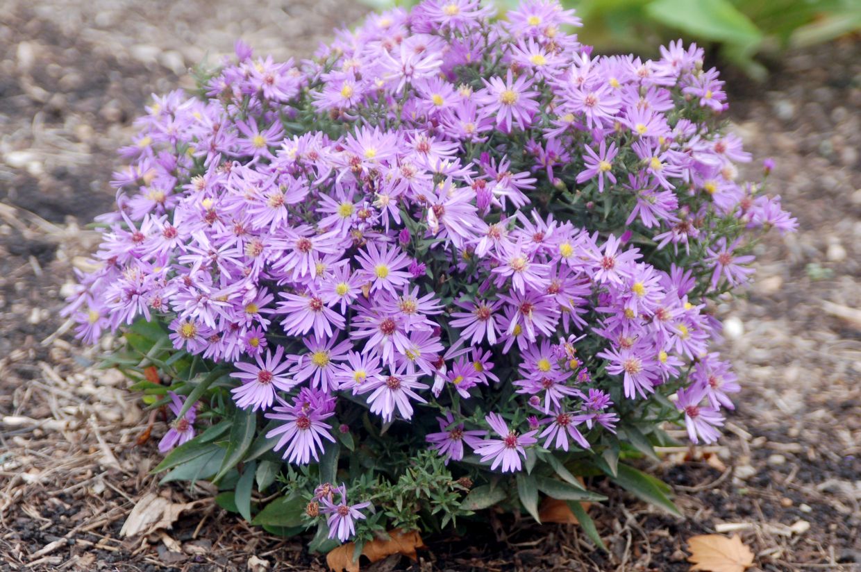 Bushy plants grow 12–15 inches tall in maturity. Deep lavender-blue flowers begin in mid-September over grayed green foliage.