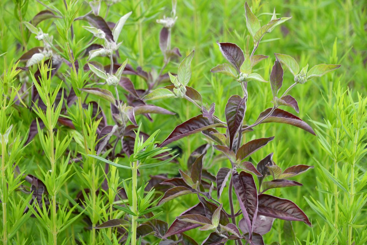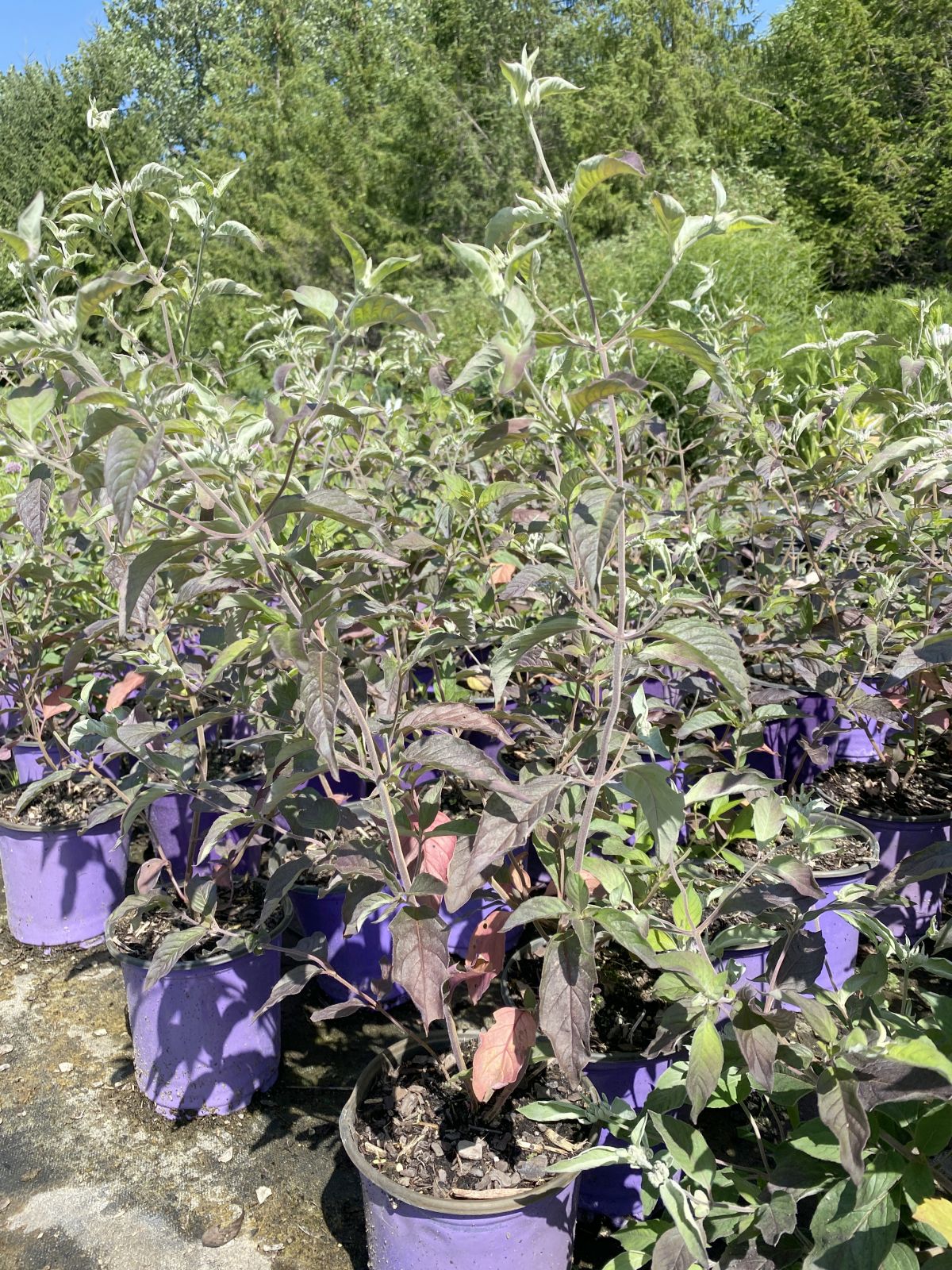 One of our most exciting new plants has a wide appeal to humans and pollinators as well. This hybrid incanum has a purple cast to the foliage below the silvered tips, and bract-like leaves surrounding the flower clusters at the tips of the long stems. These rhizomatous plants have hybrid vigor. Most any soil but wet.