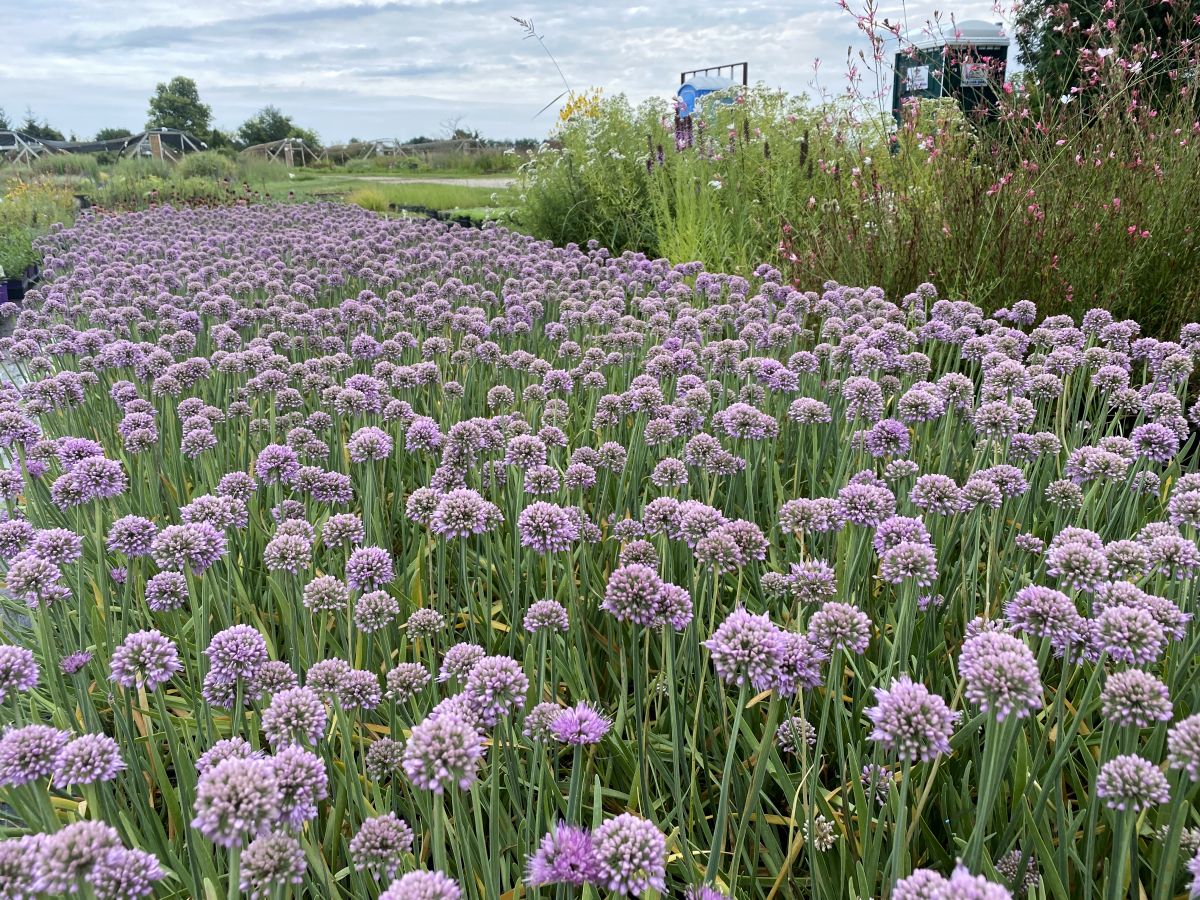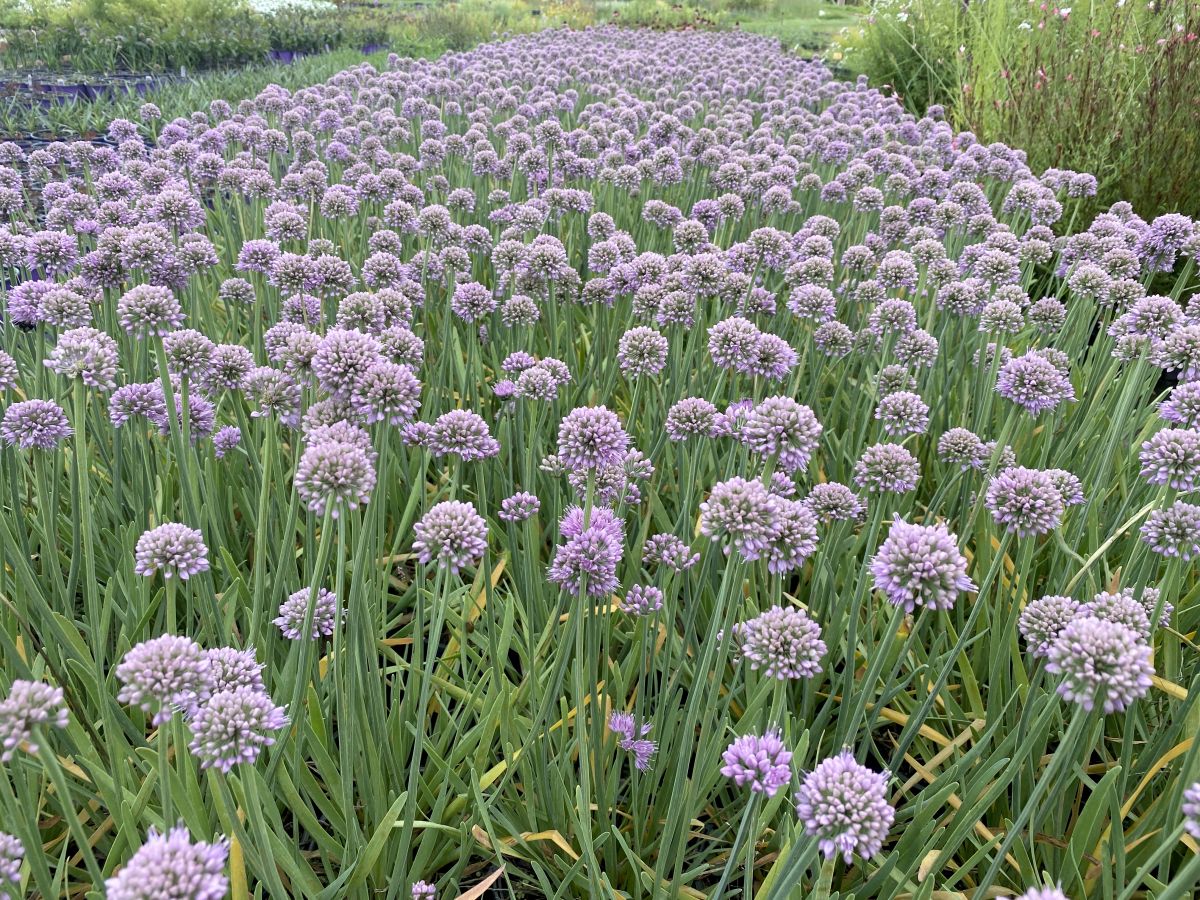 This new ornamental onion is a heavy bloomer. Blue-green foliage is 3/8" wide. Lavender colored flowers appear on uniform plants from mid-to-late summer atop 12 to 15-inch stems. Full sun, and well-drained to dry soil.
