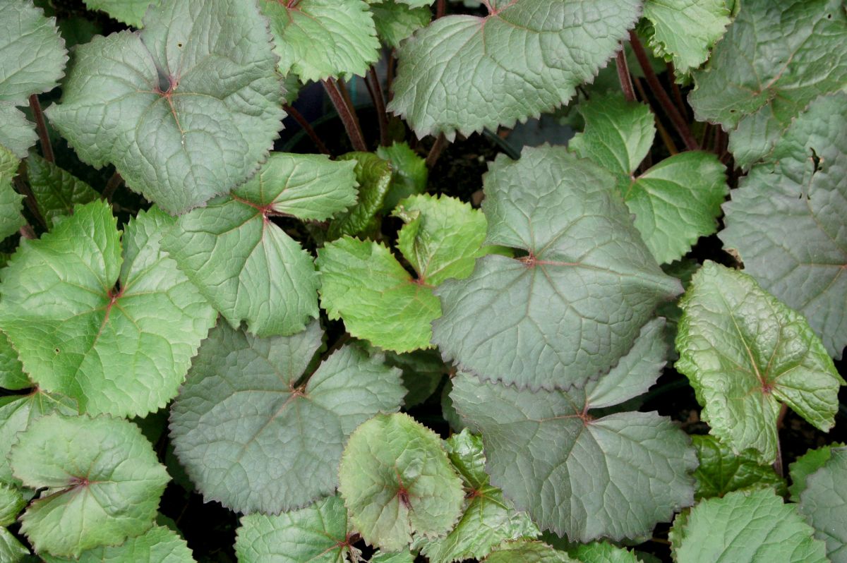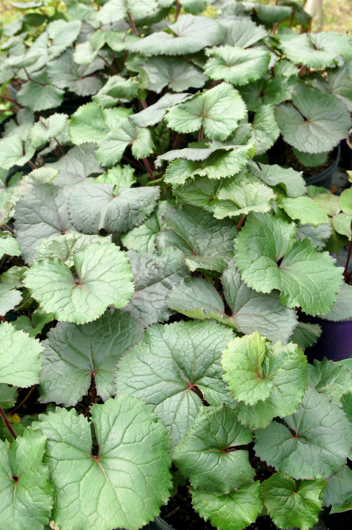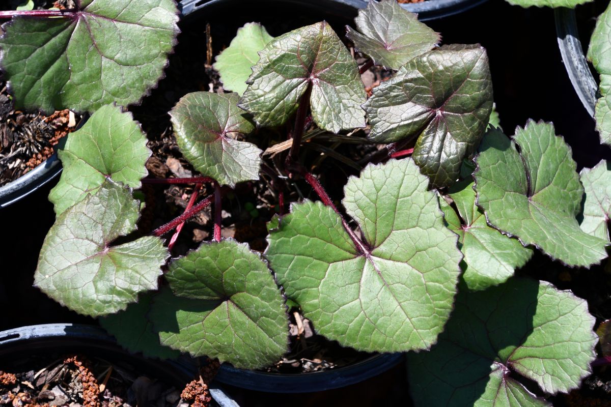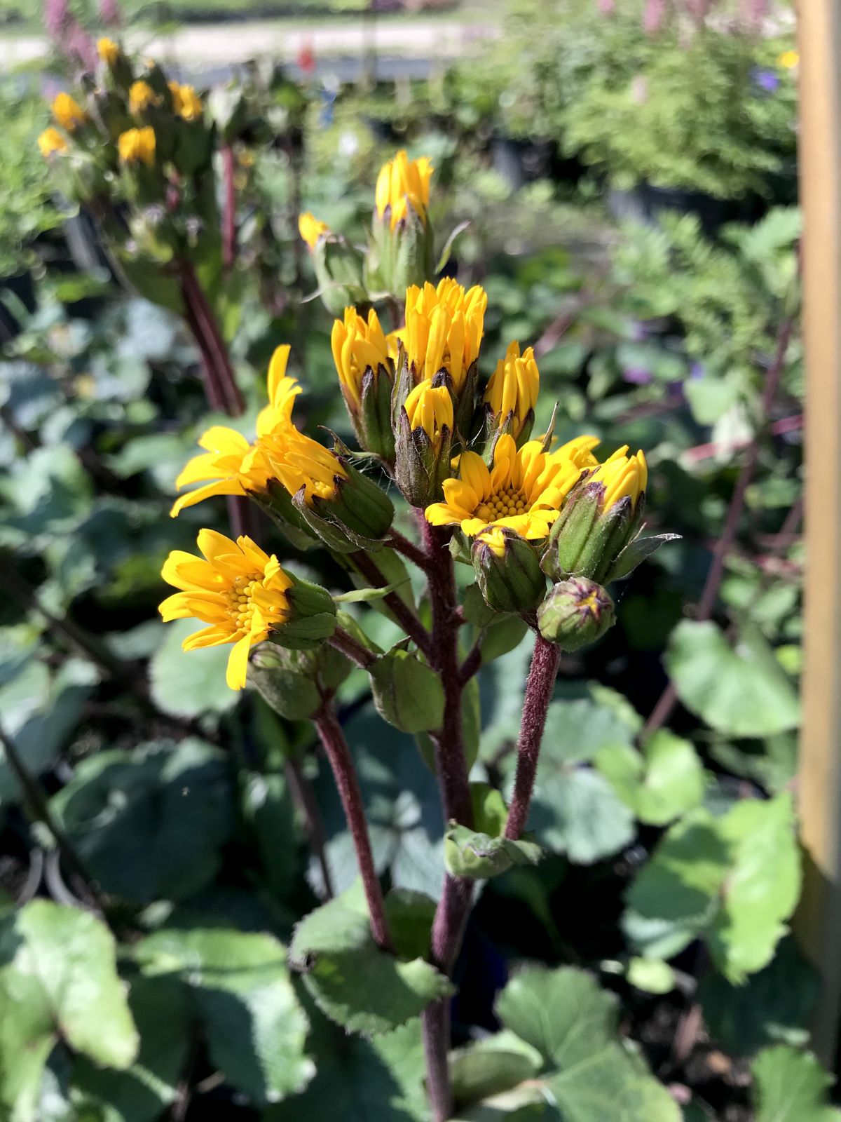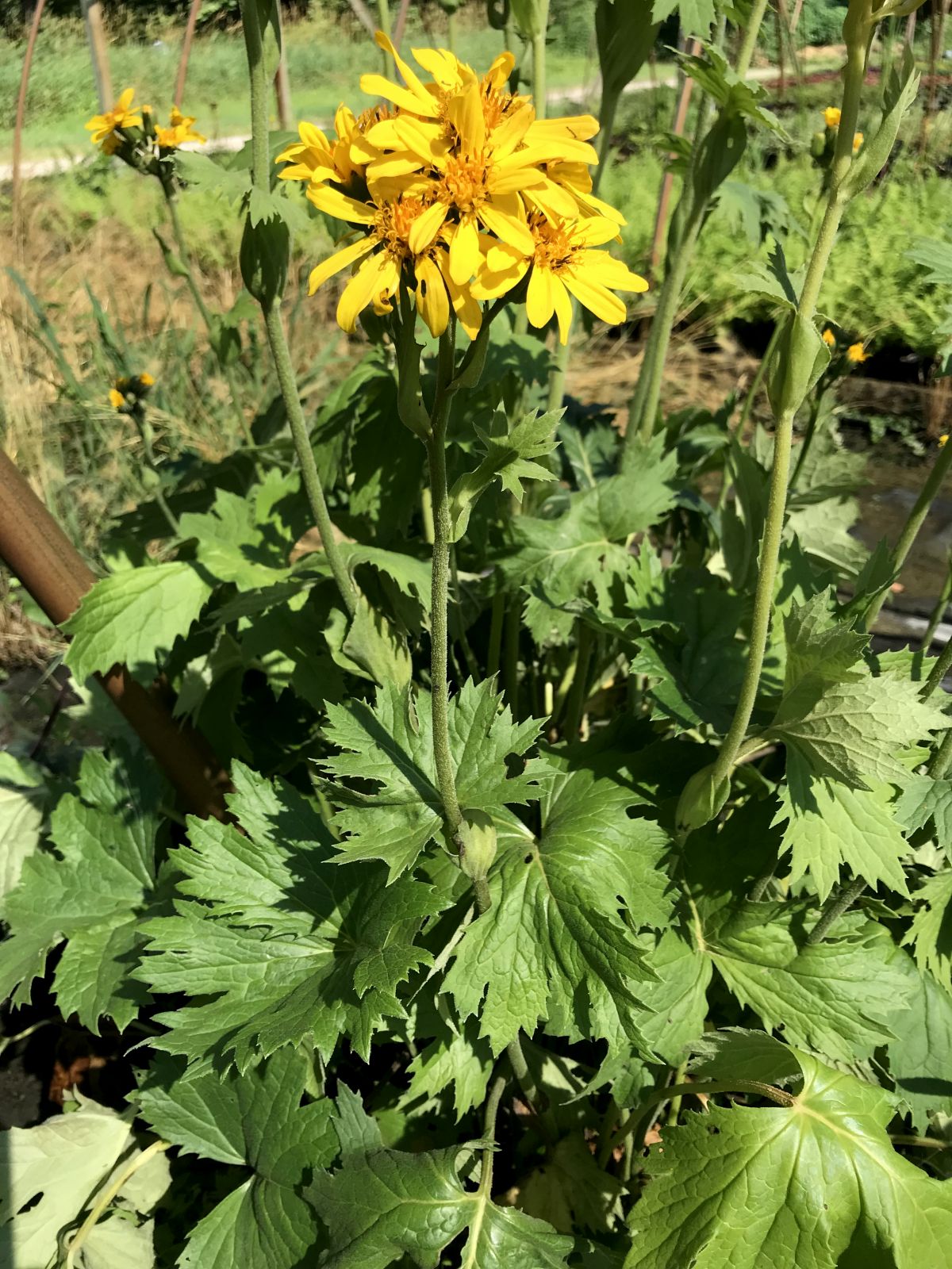After many years of observation this hybrid stands out to us. Matte green foliage with new leaves emerging lighter green and deepening with age gives the substantial plants more depth. Hybrid vigor, and rhubarb red stems hold clustered gold flowers on four-inch stems in July. Part shade with rich moist soil.