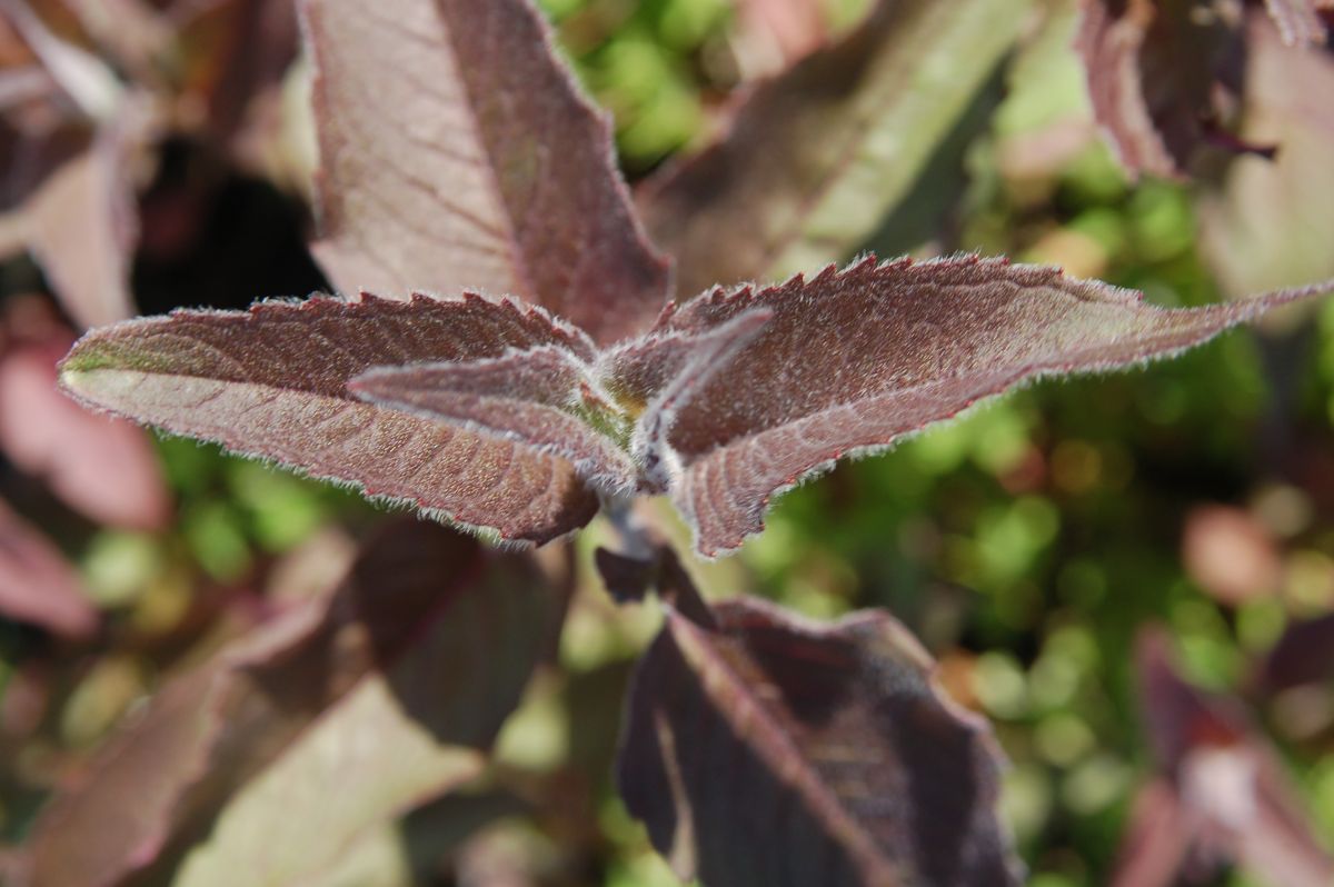 Chocolate red foliage emerges early with short, silvered hairs and chocolate red stems. Once the purple flowers bloom in June, the mildew resistant foliage turns to green. Grows to over 24 inches tall in average well-drained soil. Full sun.