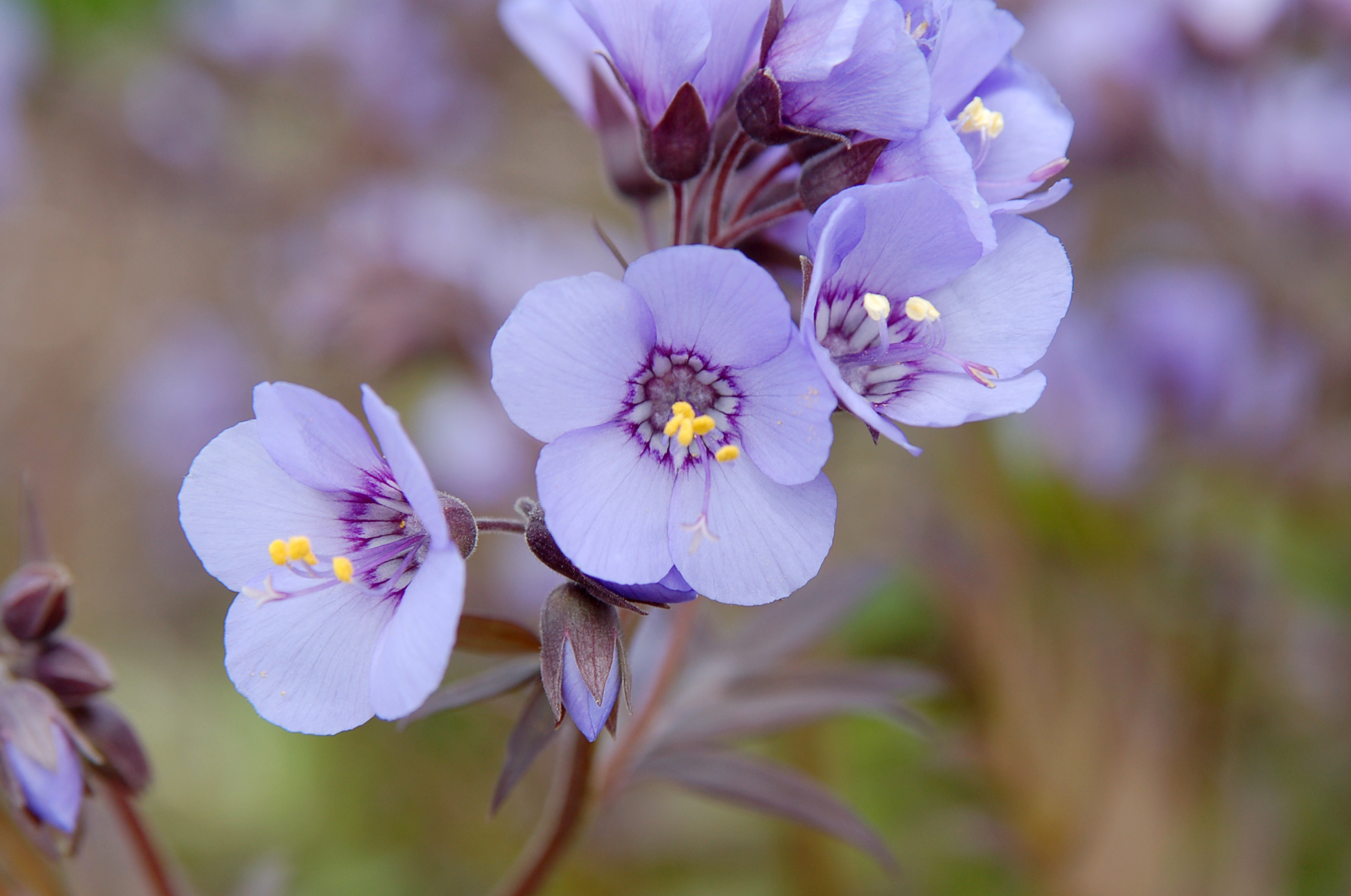 Lacy pinnate foliage emerges red and continues to hold red highlights until summer. Grape-scented blue flowers begin in May and can continue into June. Plants top out at 18–24 inches tall. Drought tolerant clumps can grow in full sun to part shade. Makes a good cut flower, too. Nice with Geum.
