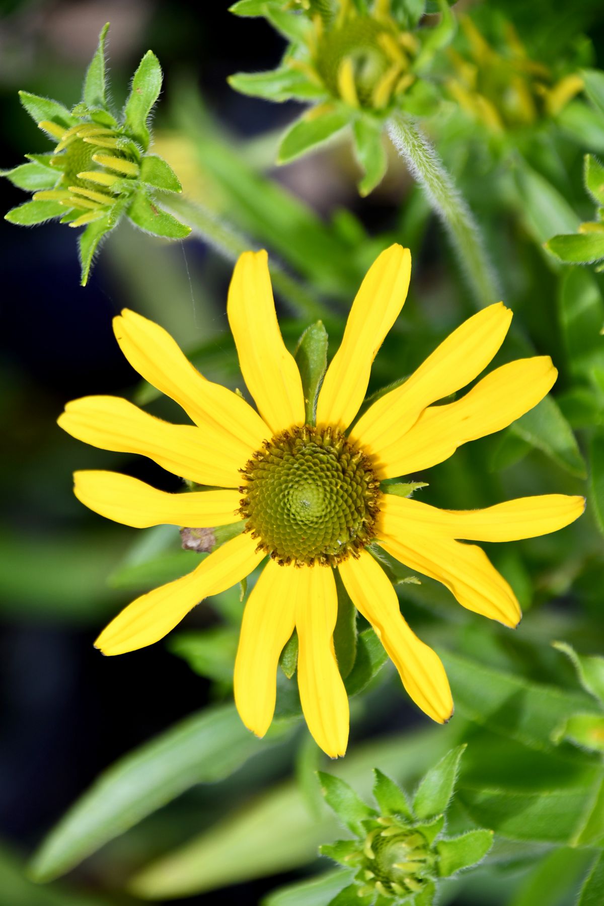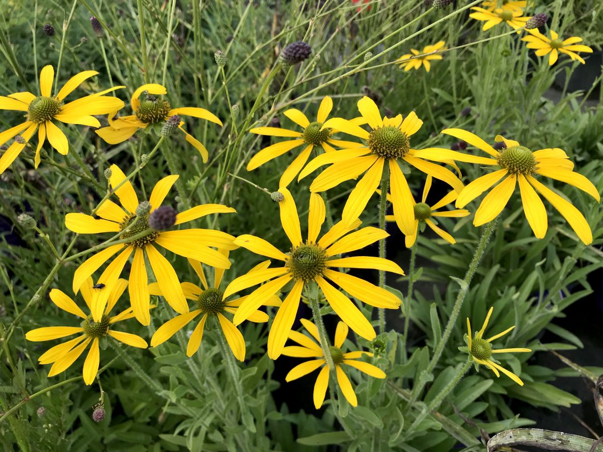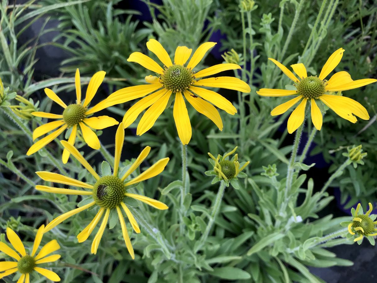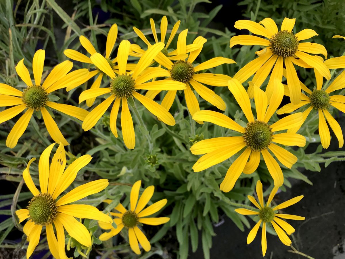 A new look in rudbeckia, this one begins with green-eyed flowers softening to chartreuse-yellow and eventually turning brown. Upright stems reach 30 inches tall on a plant 18–24 inches wide, all above thin-leaved rosettes of foliage. Full sun; average to dry soil.