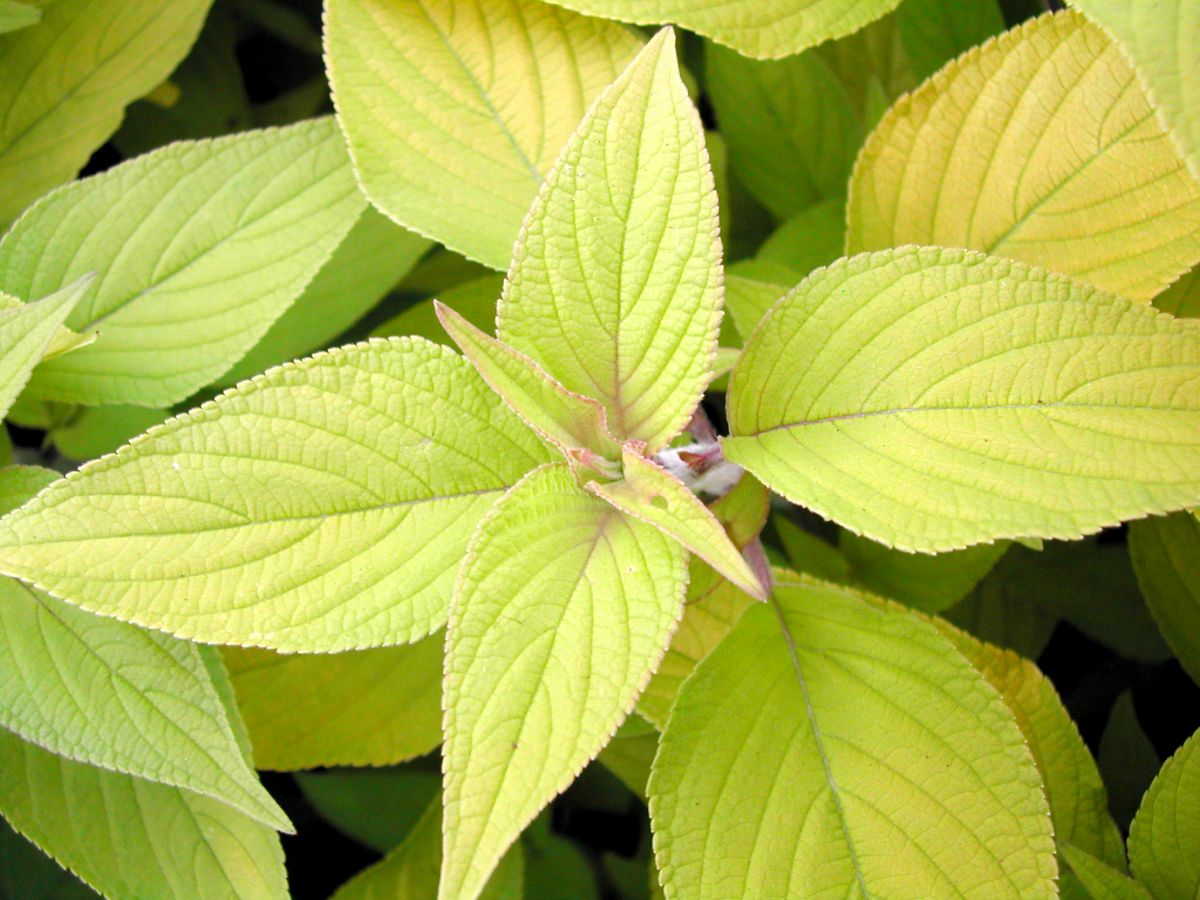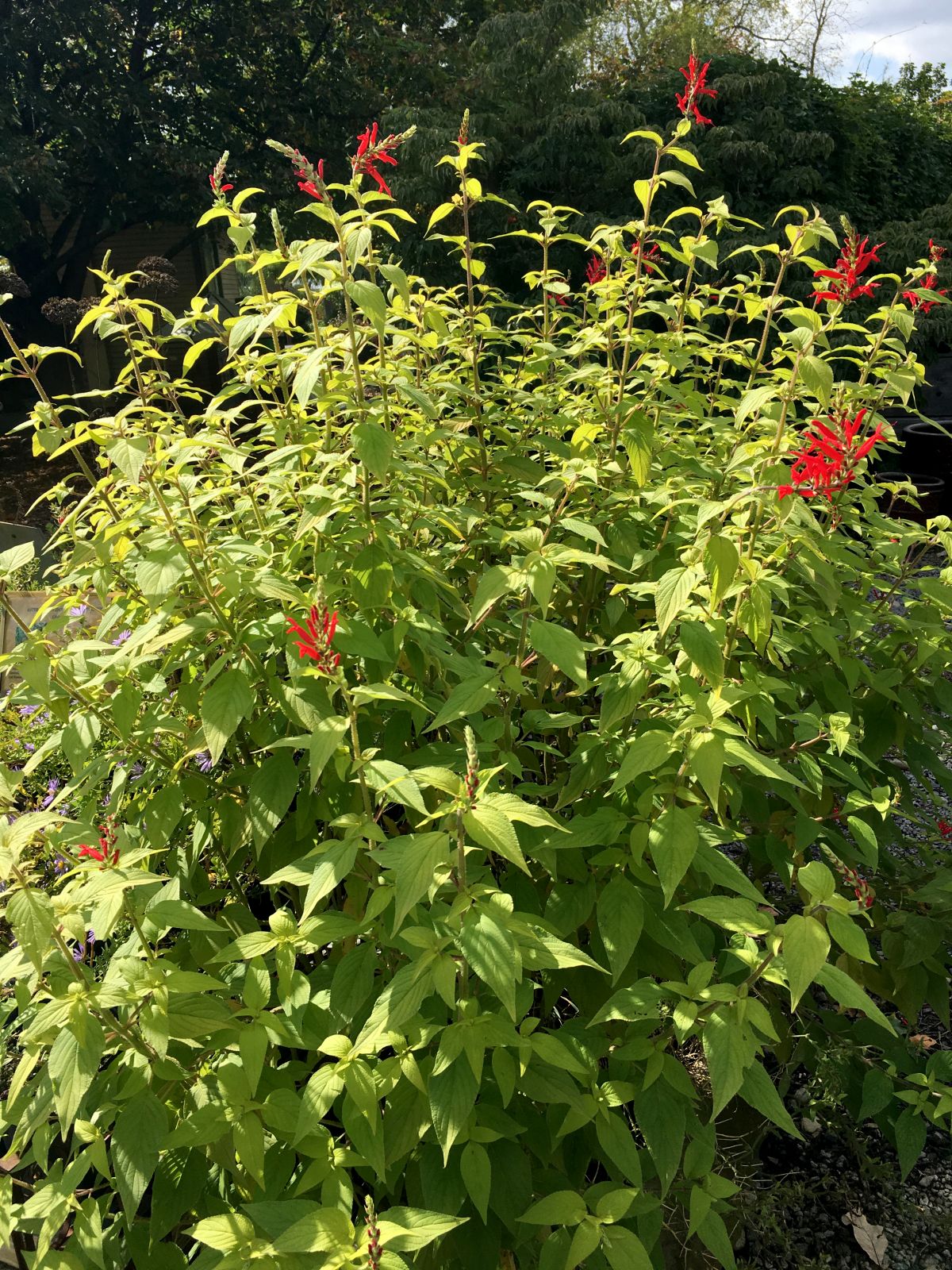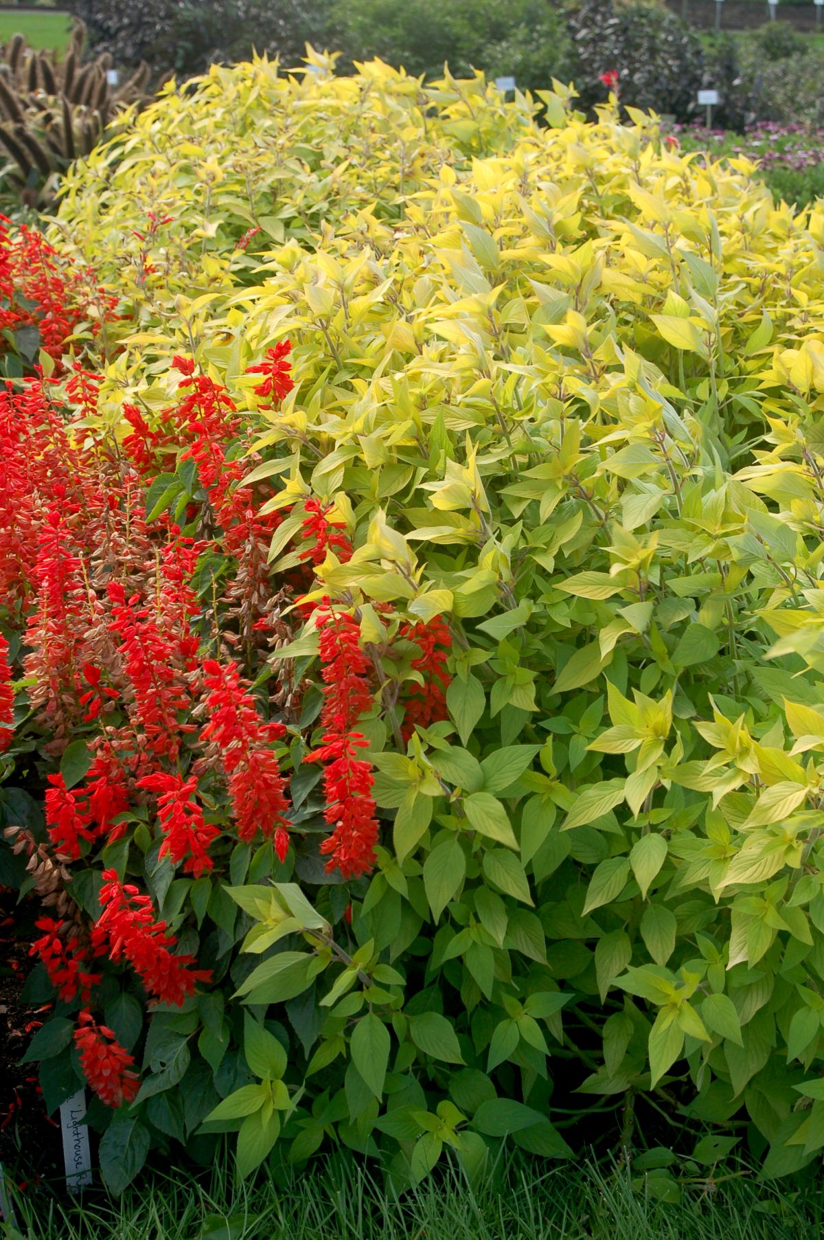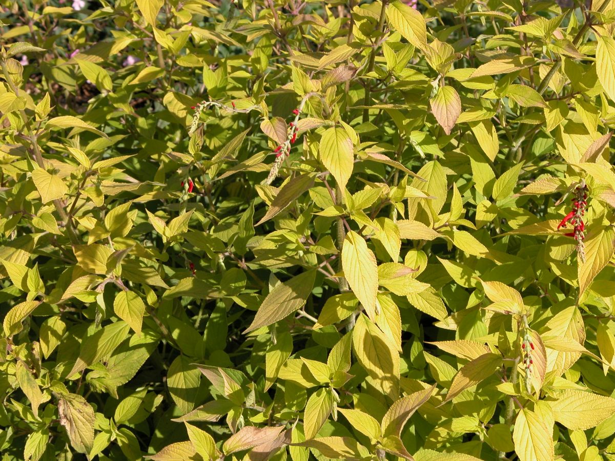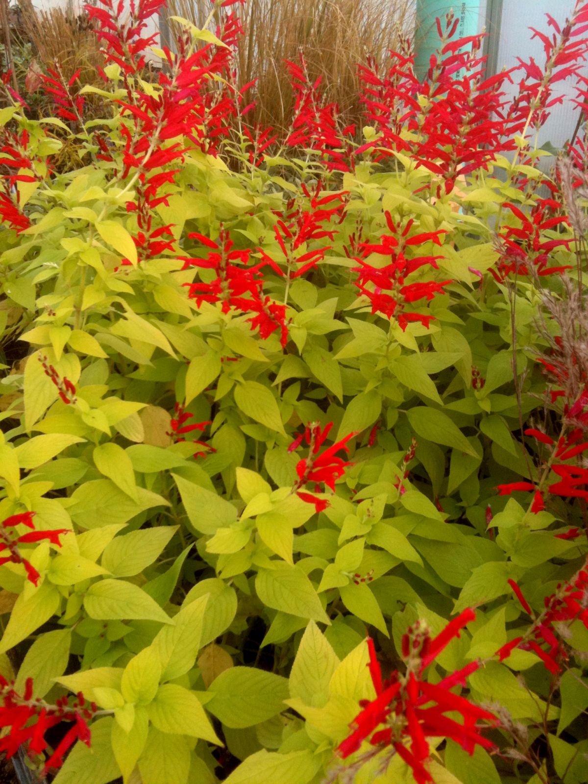 This tender perennial has limey yellow foliage that smells like pineapple and looks good all year. If kept from frost, shrubby plants bloom scarlet red at the end of October, in striking contrast to the leaves. Pineapple sage prefers well-drained to moist or even wet soil.
