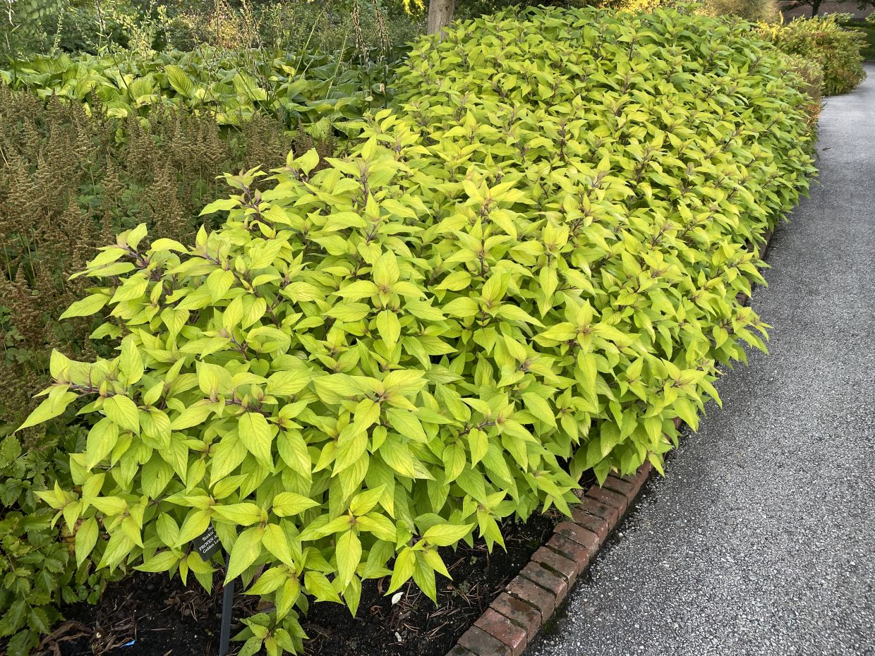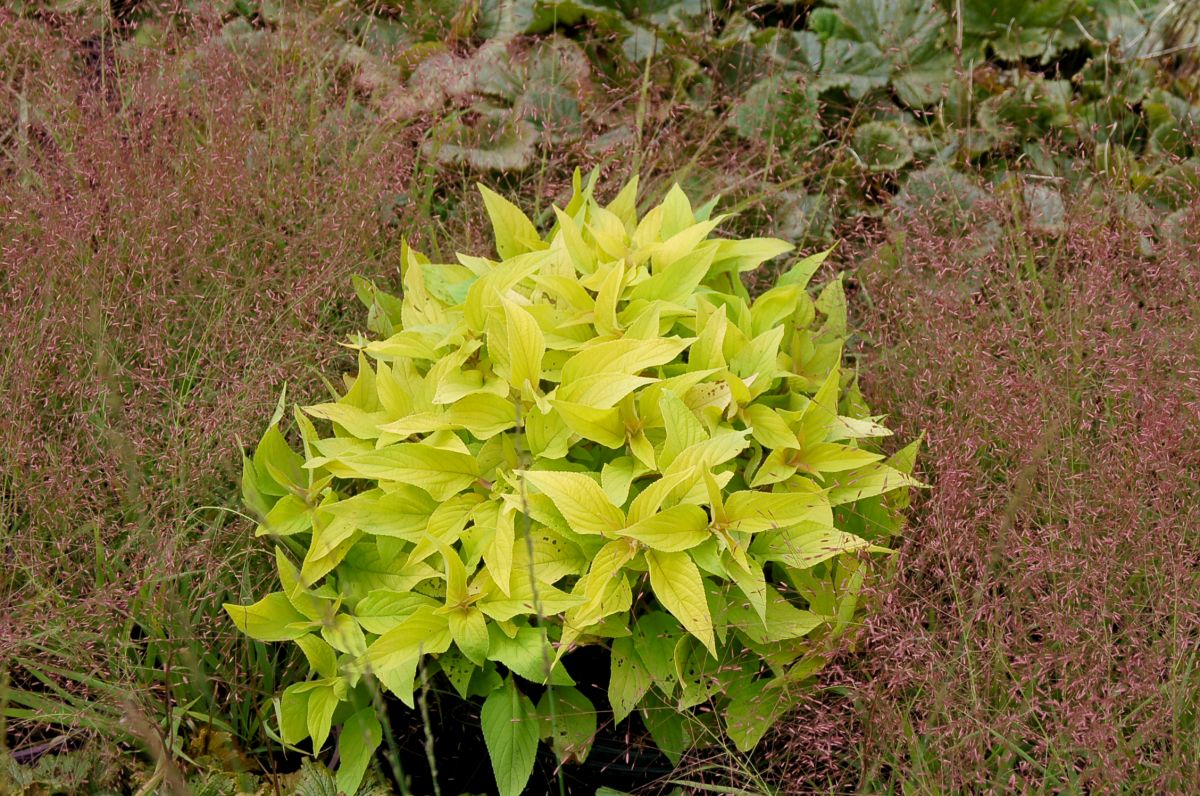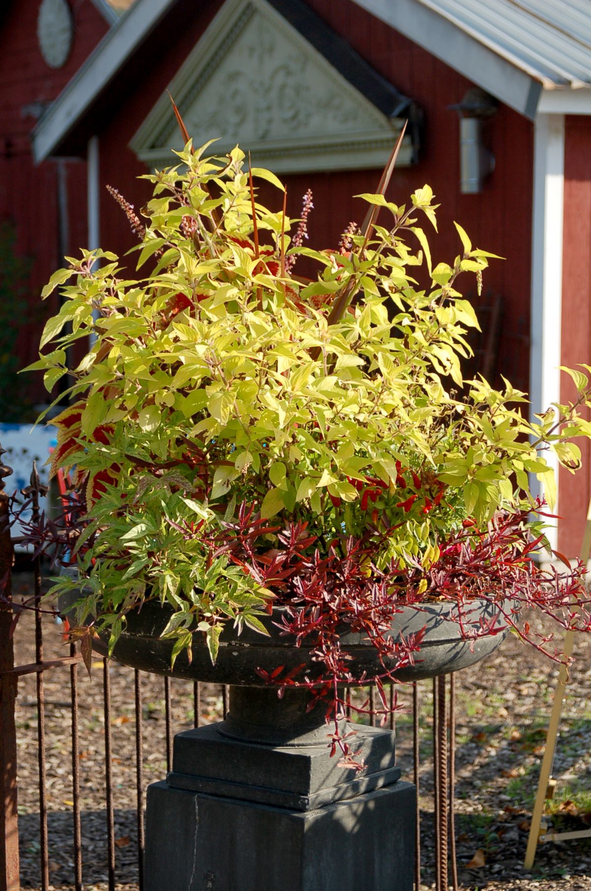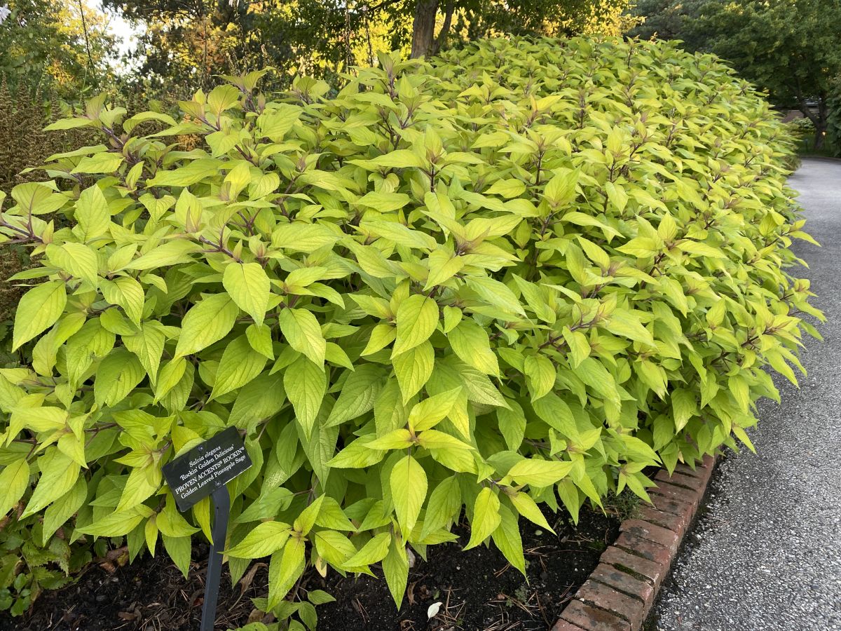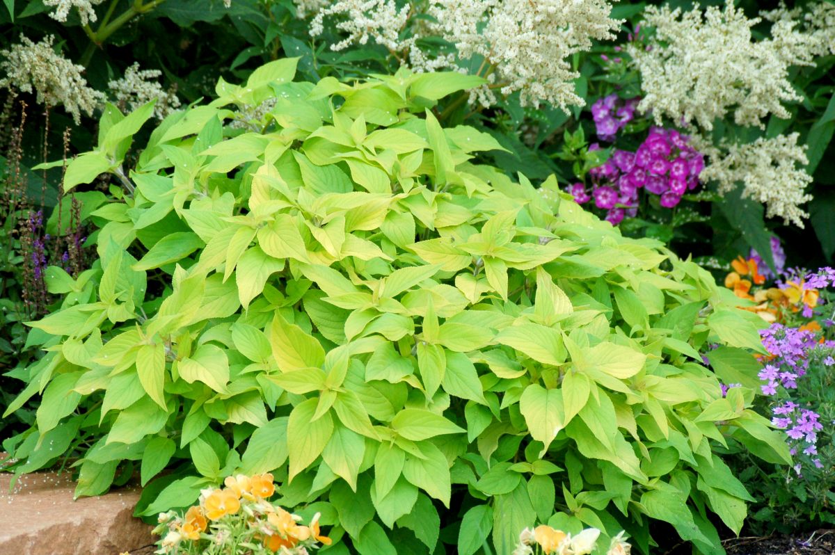 This tender perennial has limey yellow foliage that smells like pineapple and looks good all year. If kept from frost, shrubby plants bloom scarlet red at the end of October, in striking contrast to the leaves. Pineapple sage prefers well-drained to moist or even wet soil.