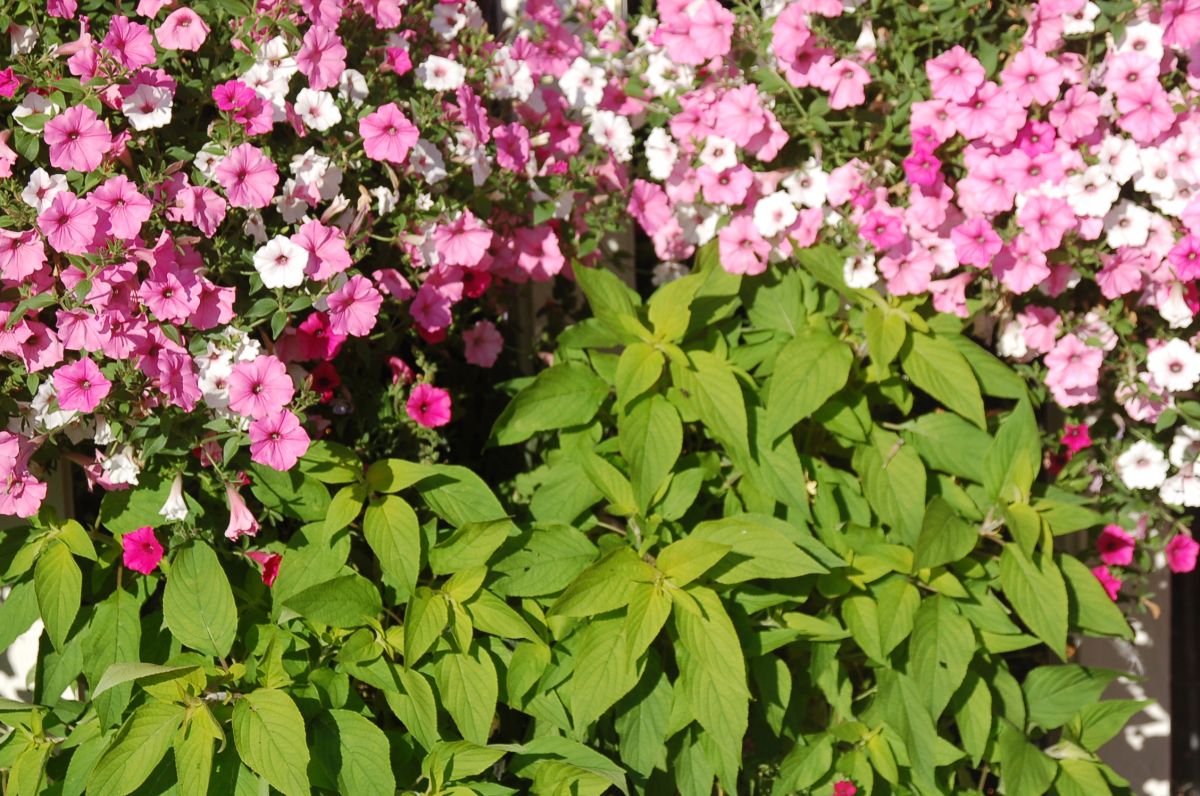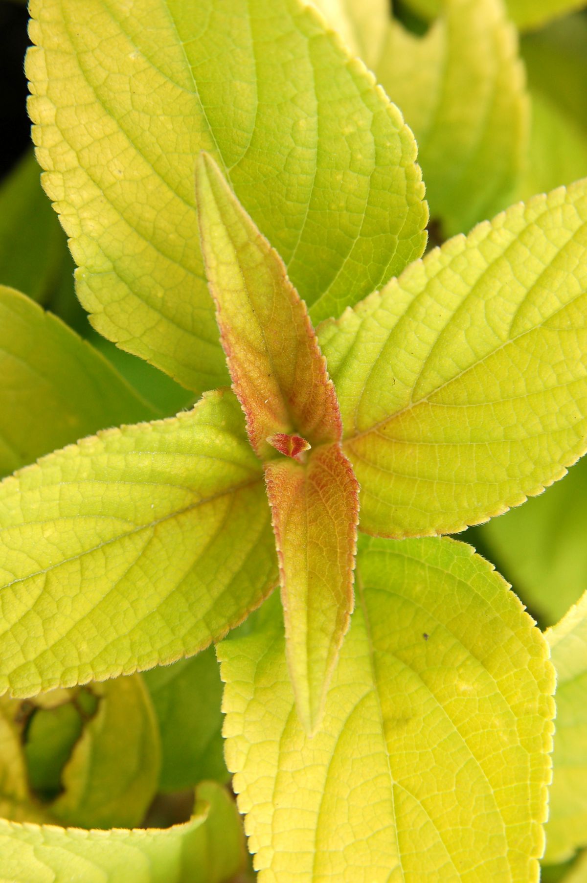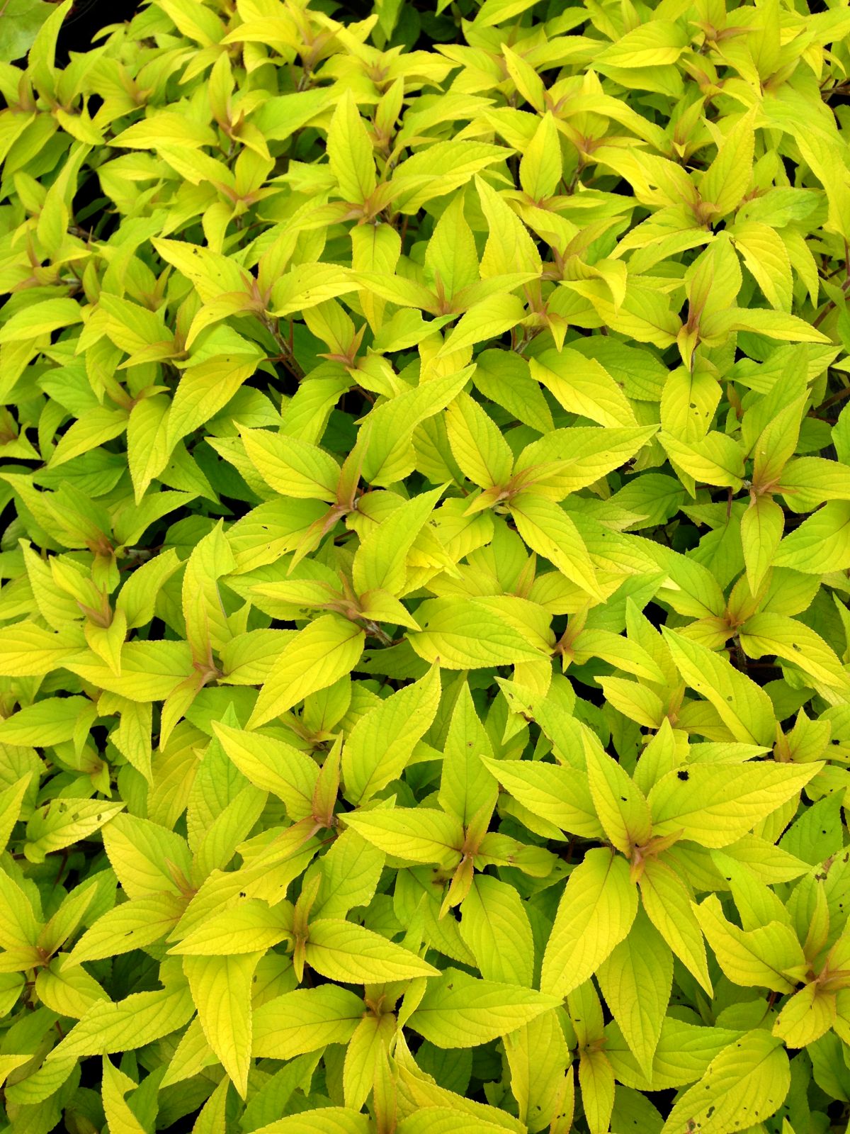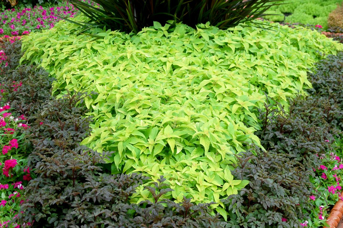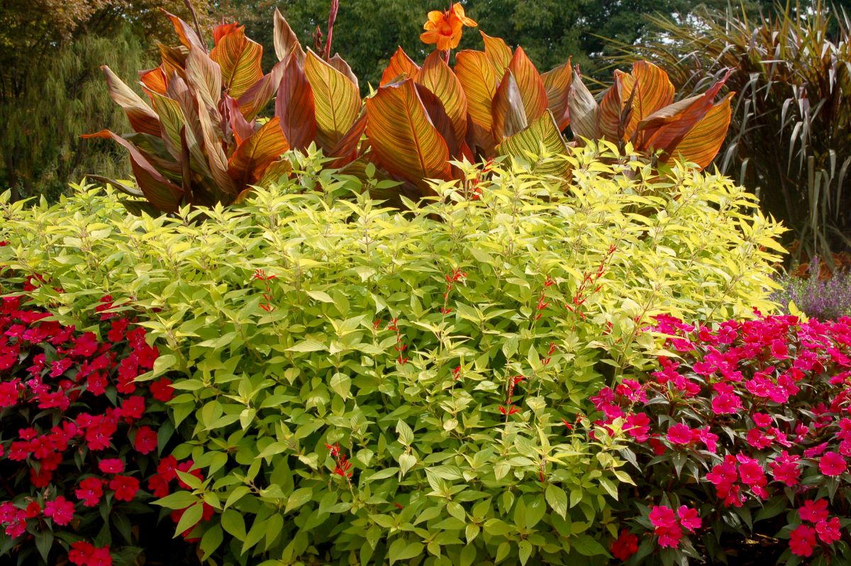 This tender perennial has limey yellow foliage that smells like pineapple and looks good all year. If kept from frost, shrubby plants bloom scarlet red at the end of October, in striking contrast to the leaves. Pineapple sage prefers well-drained to moist or even wet soil.