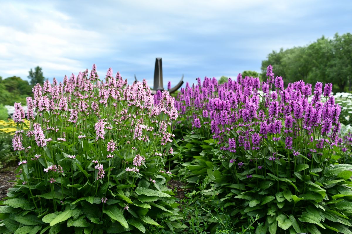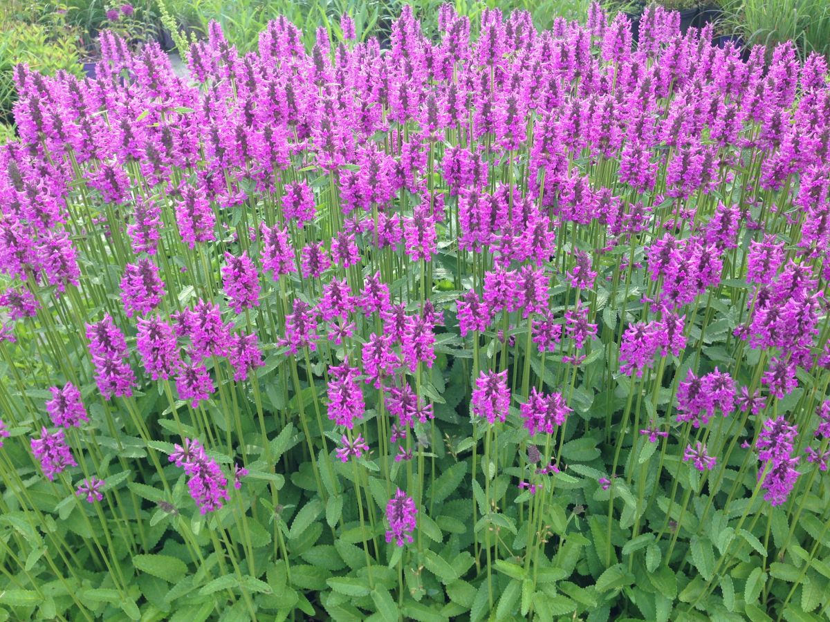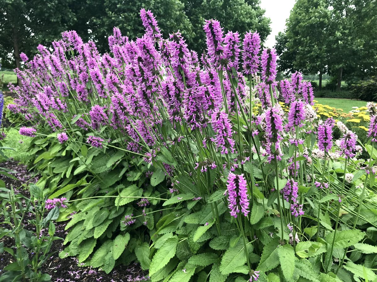 June is a romantic time of year in the garden and this stachys adds to the drama with longer spikes of pinker-purple flowers. Very upright plants work nicely with Monarda 'Mojo'. Crinkled green foliage looks great all season and resists deer. Average to moist soil is best.