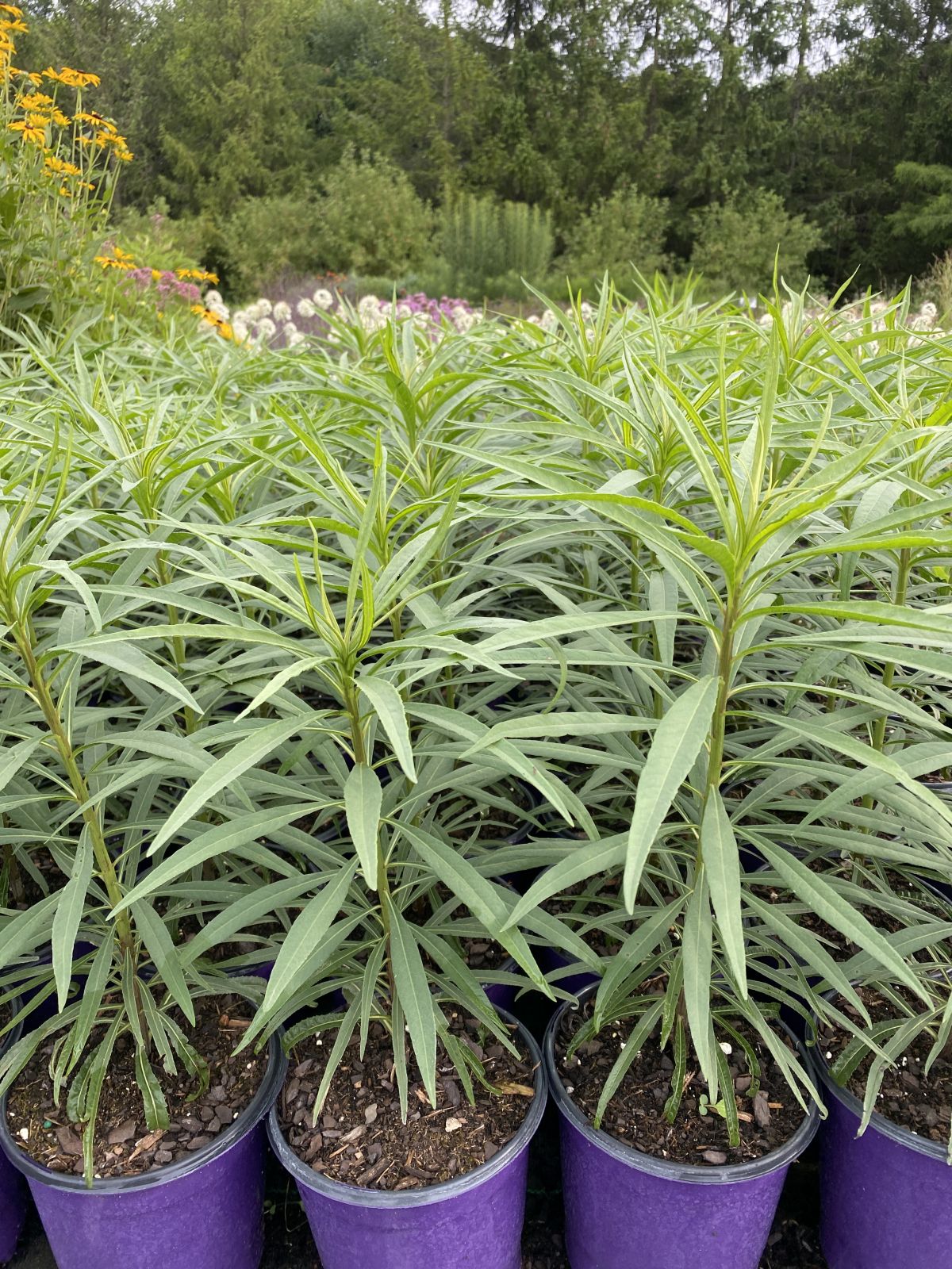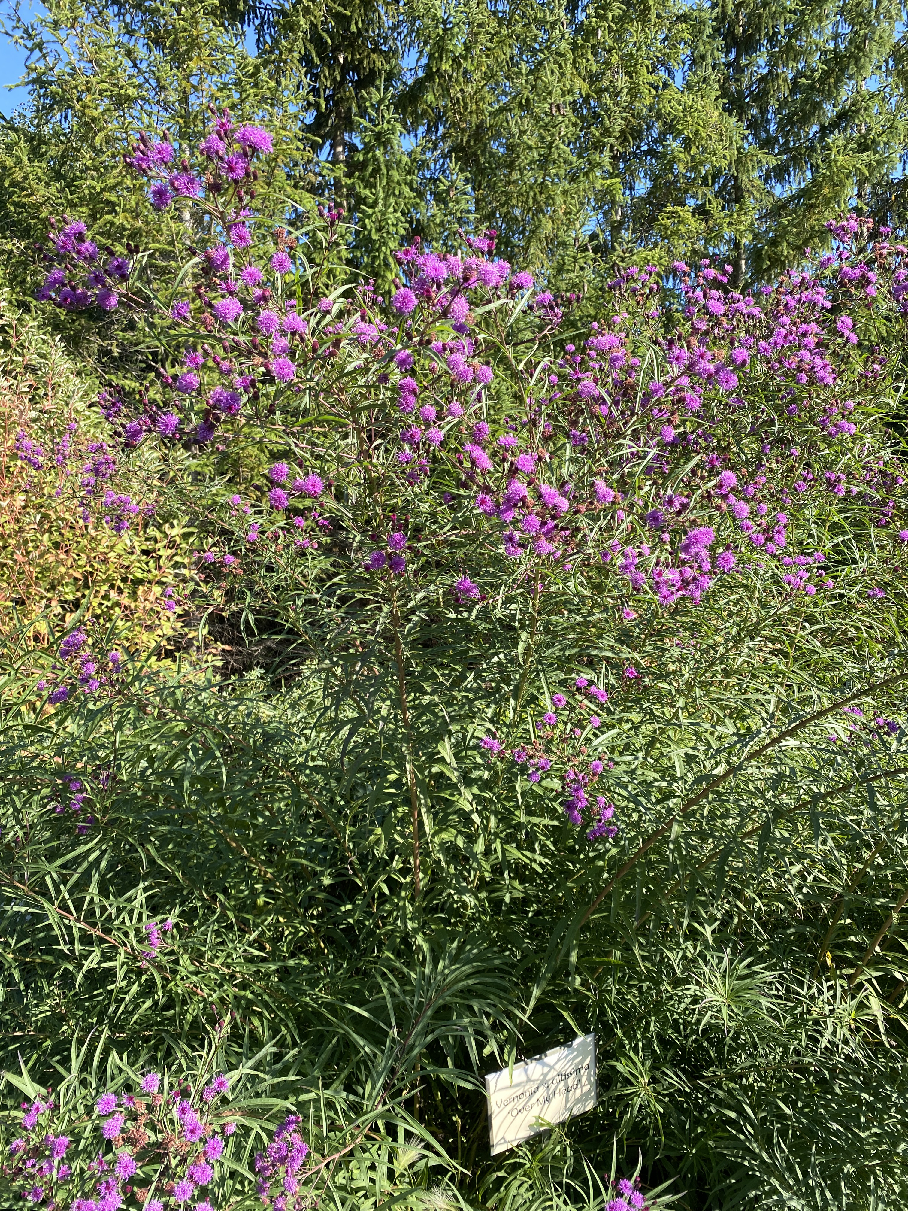 Our second ironweed, this seedling of Vernonia altissima likely has 'Southern Cross' as the other parent. Substantial plants grow very tall. Foliage reaches one inch wide by eight to ten inches long, giving the whole plant a semi-tropical feel due to its abundance. Large clusters of one-inch purple flowers bloom on wide open panicles, attracting pollinators. Average soil is best.