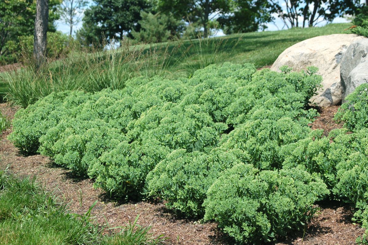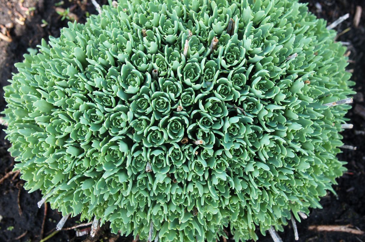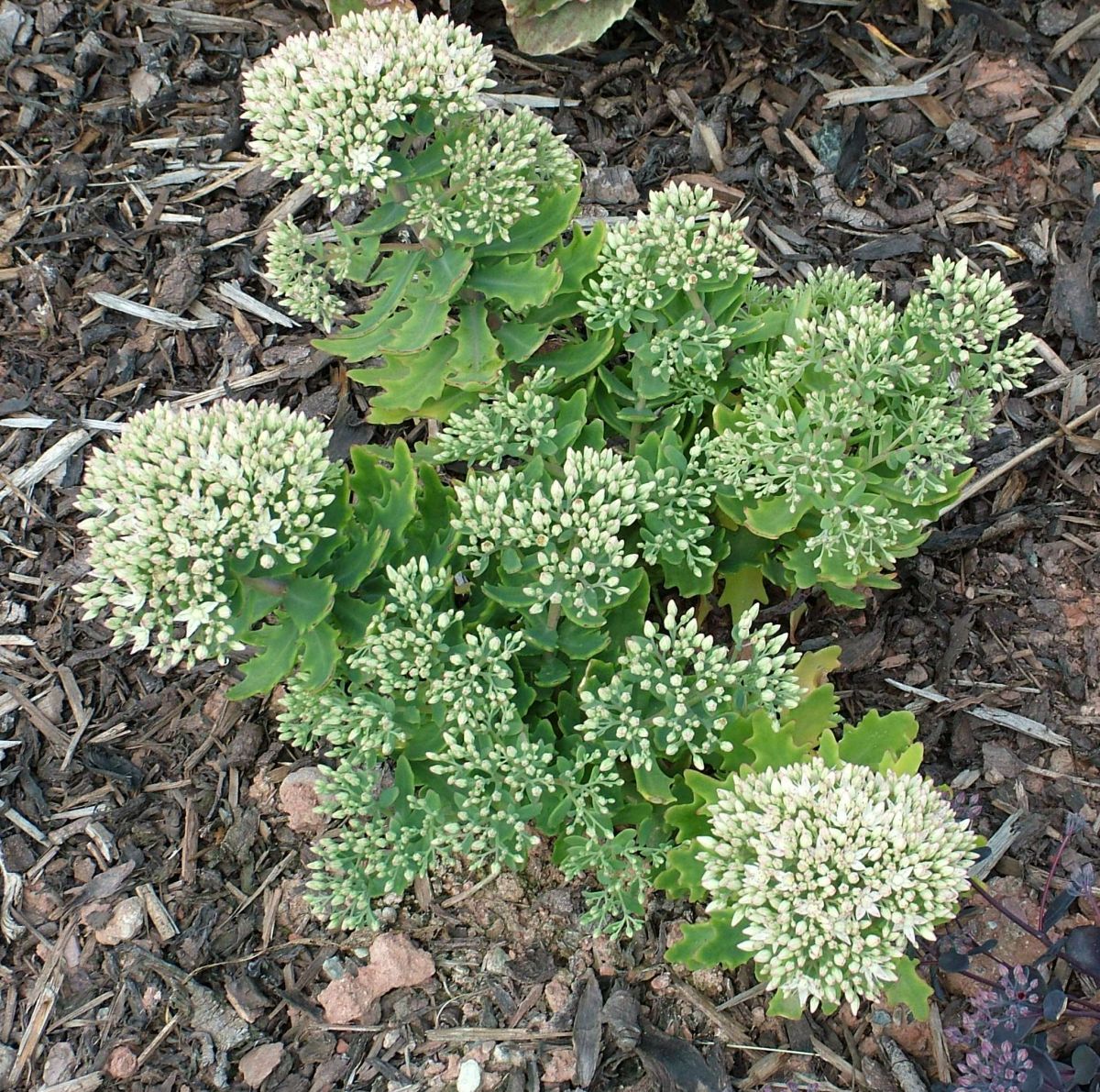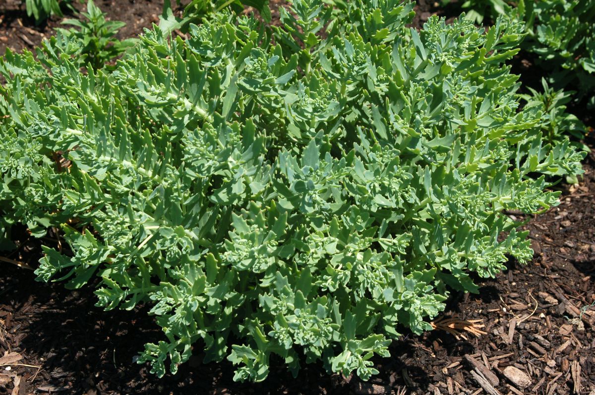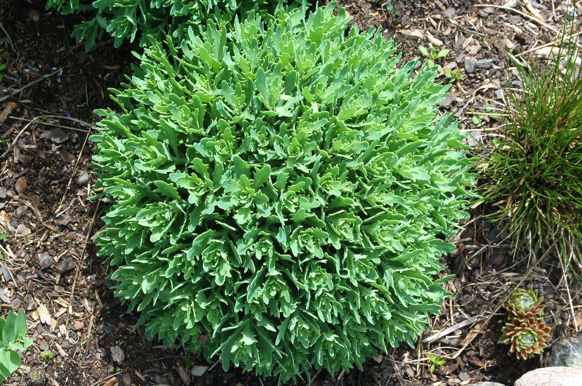 Unique pointed gray-green foliage emerges in spring on strongly mounding domes, slowly expanding to 10–12-inch mounds. White spectabile-type flowers bloom from the end of August into September. Full sun; well-drained soil.