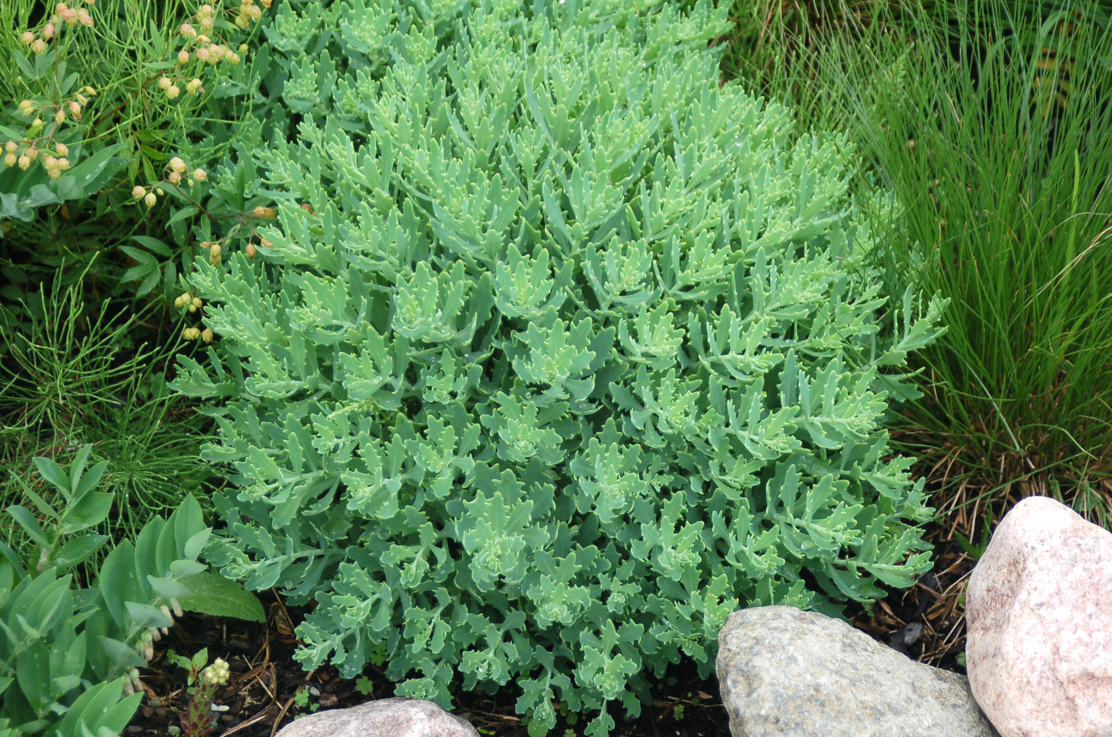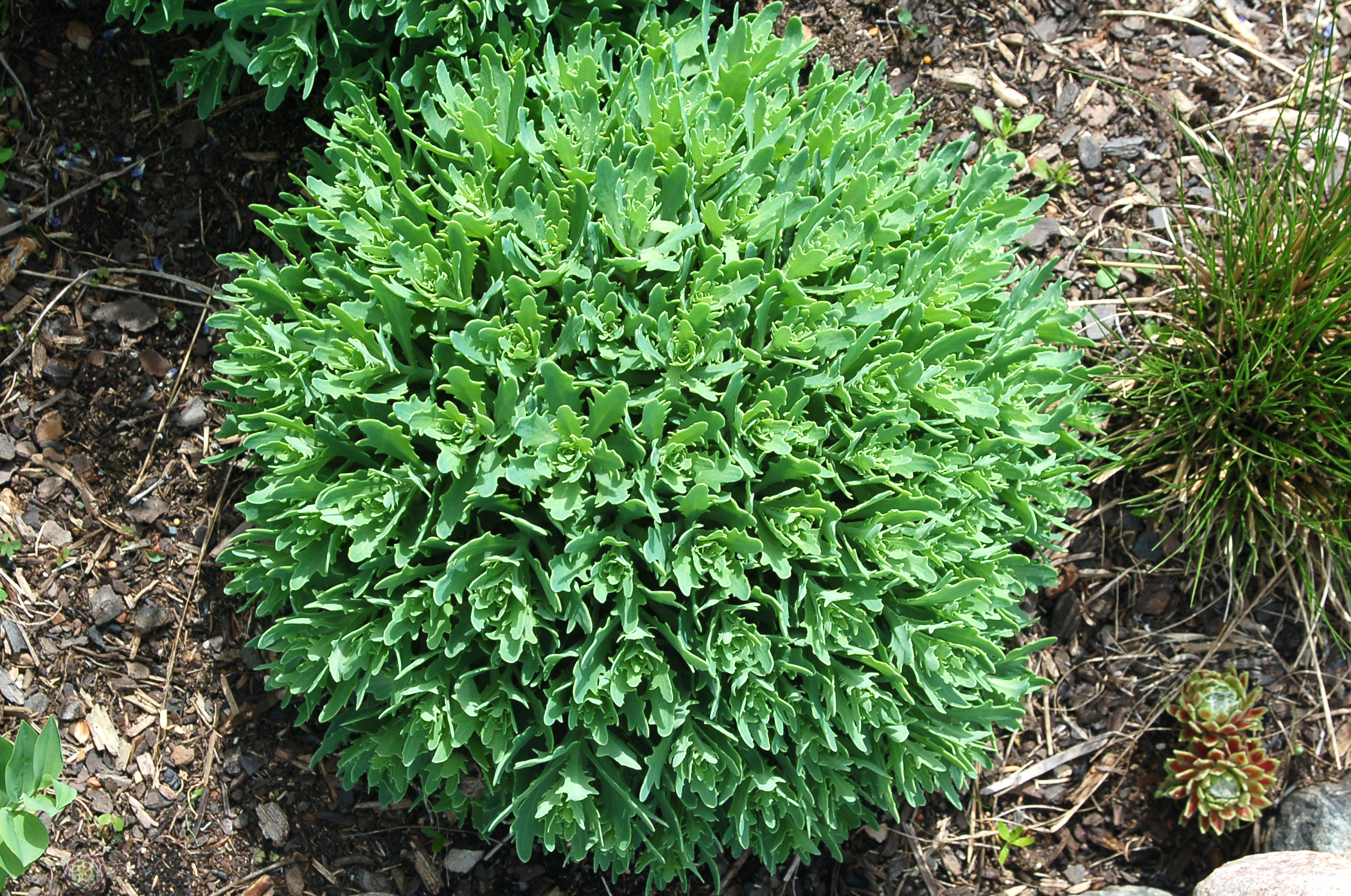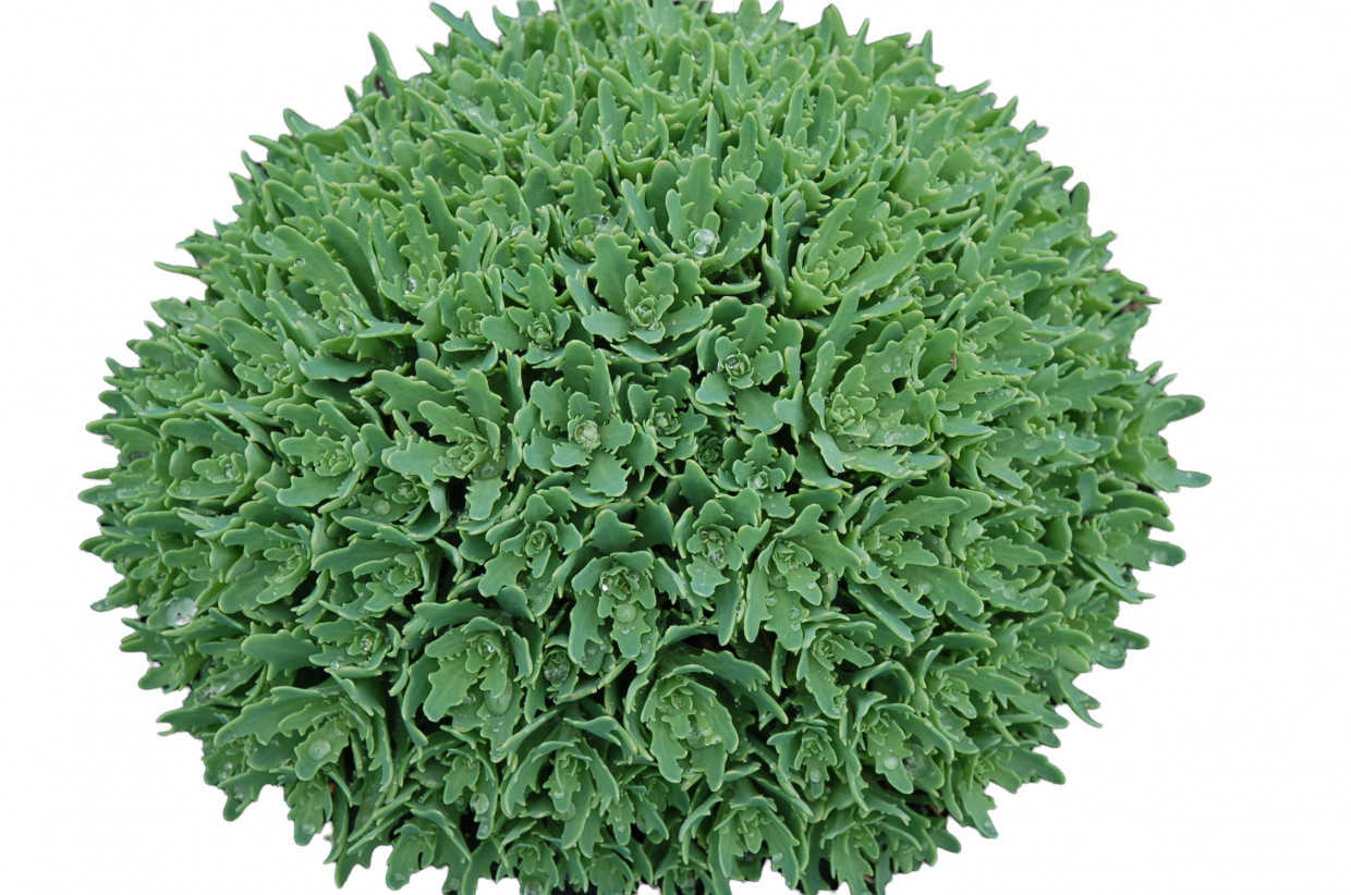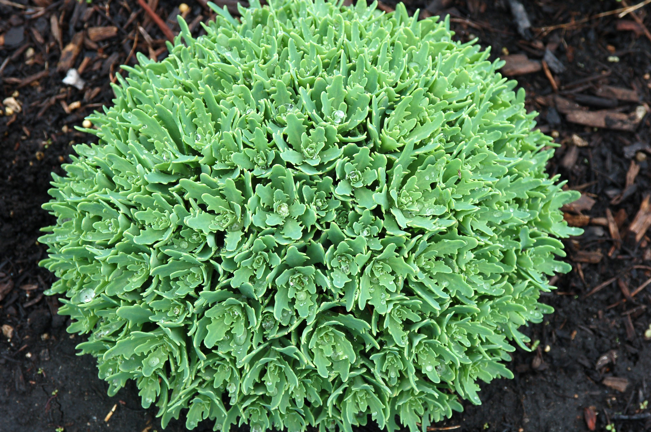 Unique pointed gray-green foliage emerges in spring on strongly mounding domes, slowly expanding to 10–12-inch mounds. White spectabile-type flowers bloom from the end of August into September. Full sun; well-drained soil.