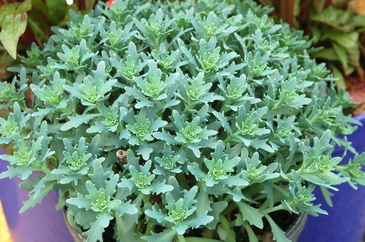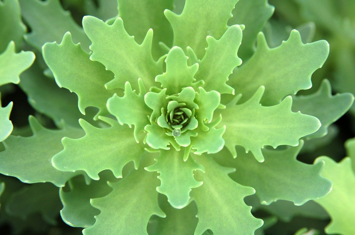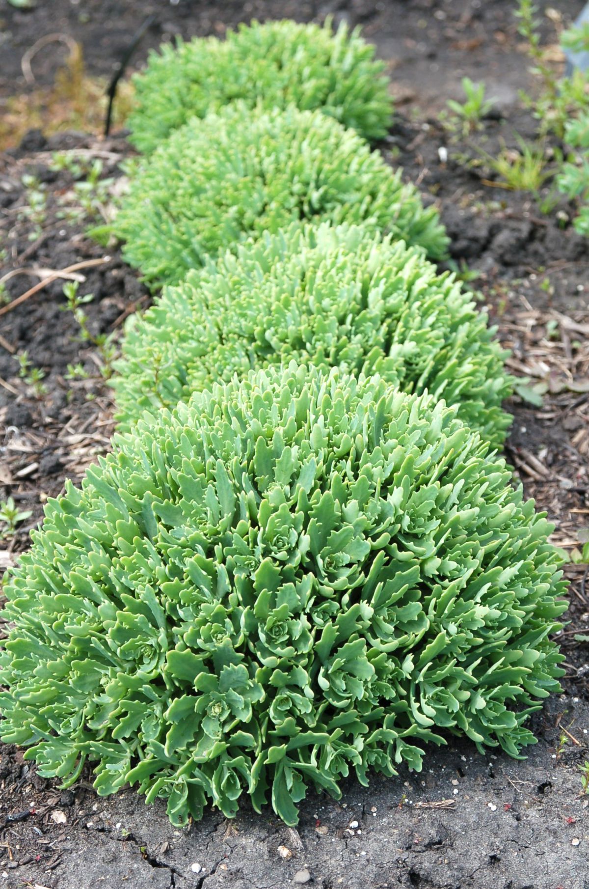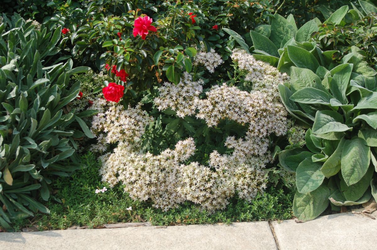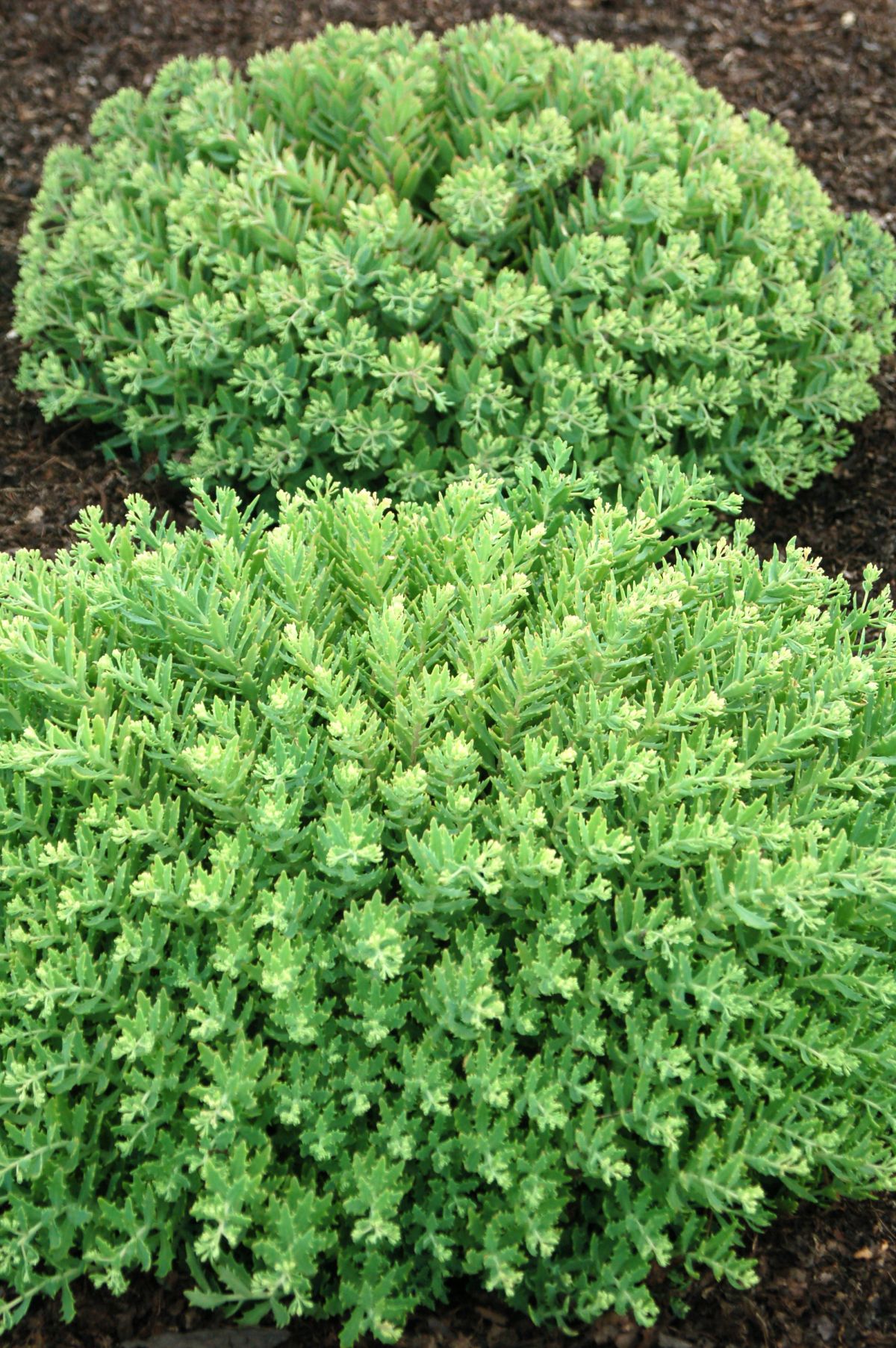 Unique pointed gray-green foliage emerges in spring on strongly mounding domes, slowly expanding to 10–12-inch mounds. White spectabile-type flowers bloom from the end of August into September. Full sun; well-drained soil.